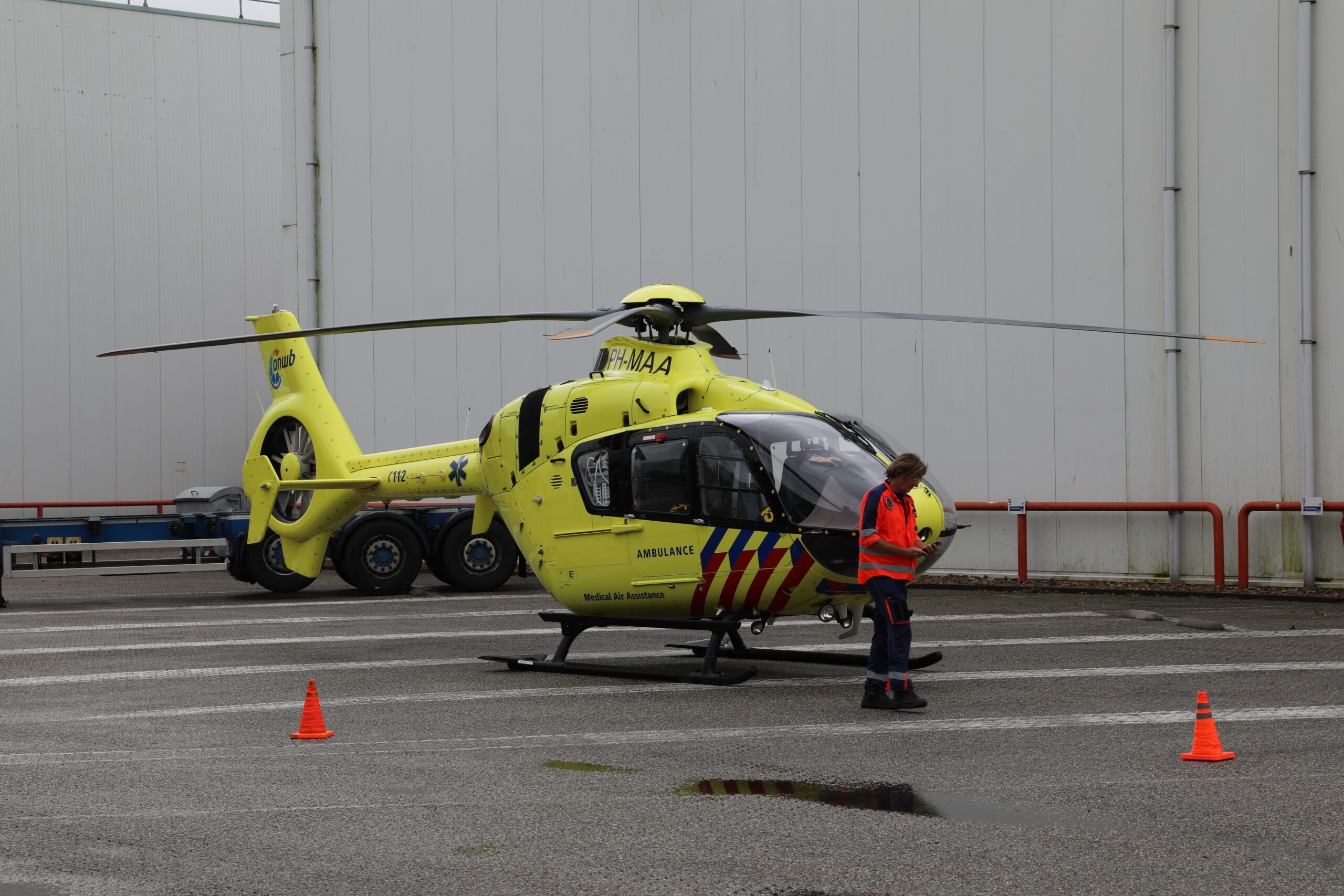 De man viel uit de cabine van zijn vrachtwagen en raakte daarbij zo zwaar gewond dat twee ambulances en een traumateam ter plaatse kwamen. Na eerste zorg op straat is de chauffeur met spoed naar het ziekenhuis vervoerd.