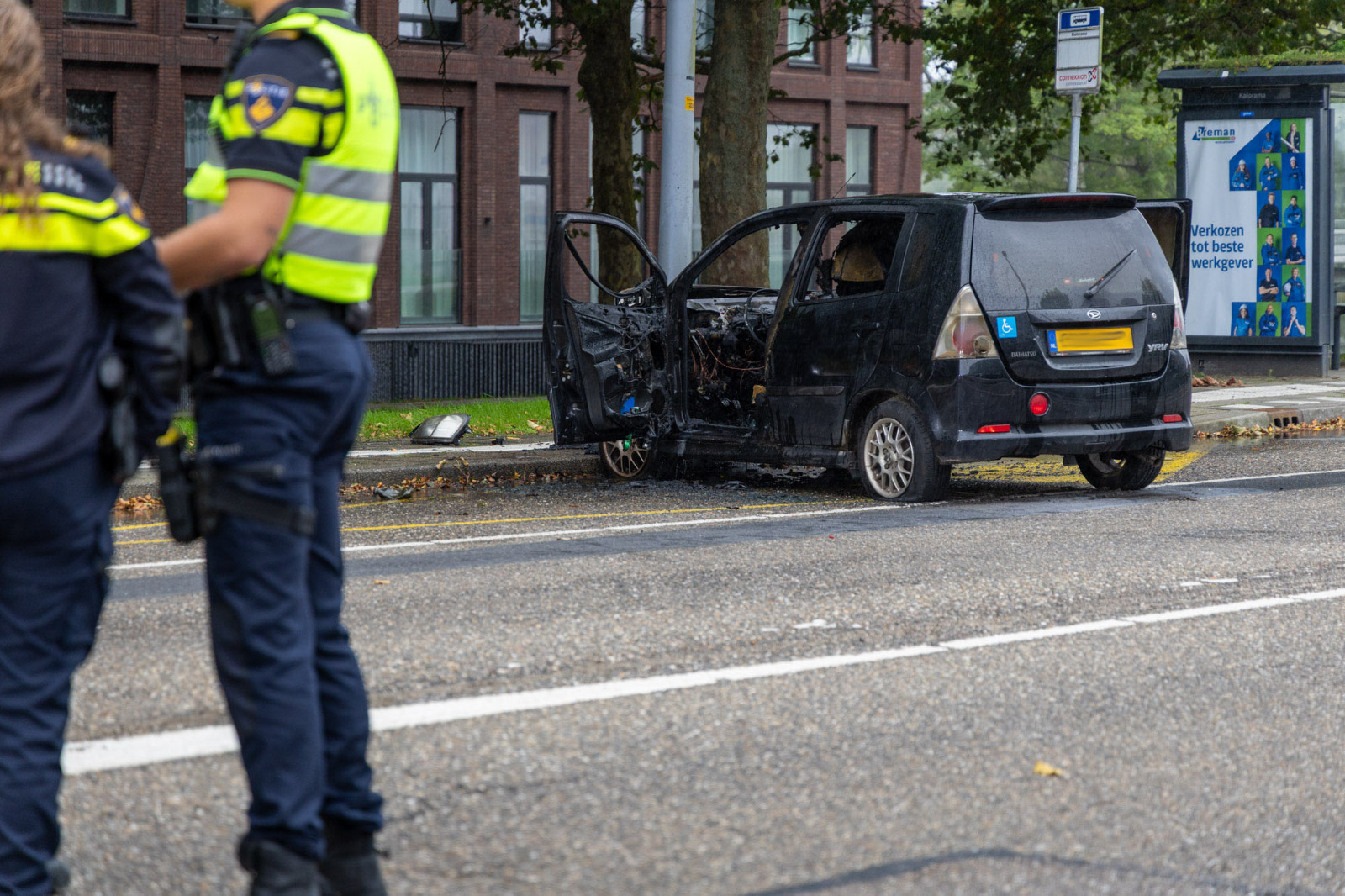 Een automobilist verloor de macht over het stuur, botste op een verkeerspaal en kwam tegen een lantaarnpaal tot stilstand. De auto vloog in brand, maar omstanders trokken de bestuurder tijdig uit het voertuig.