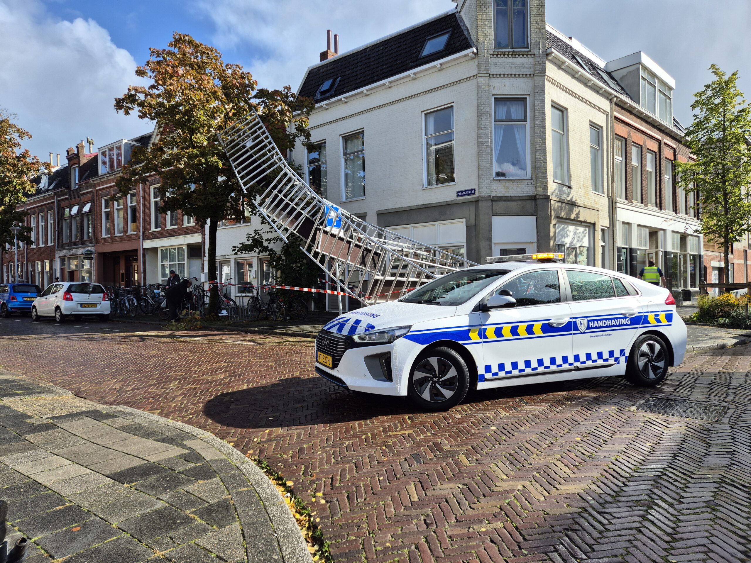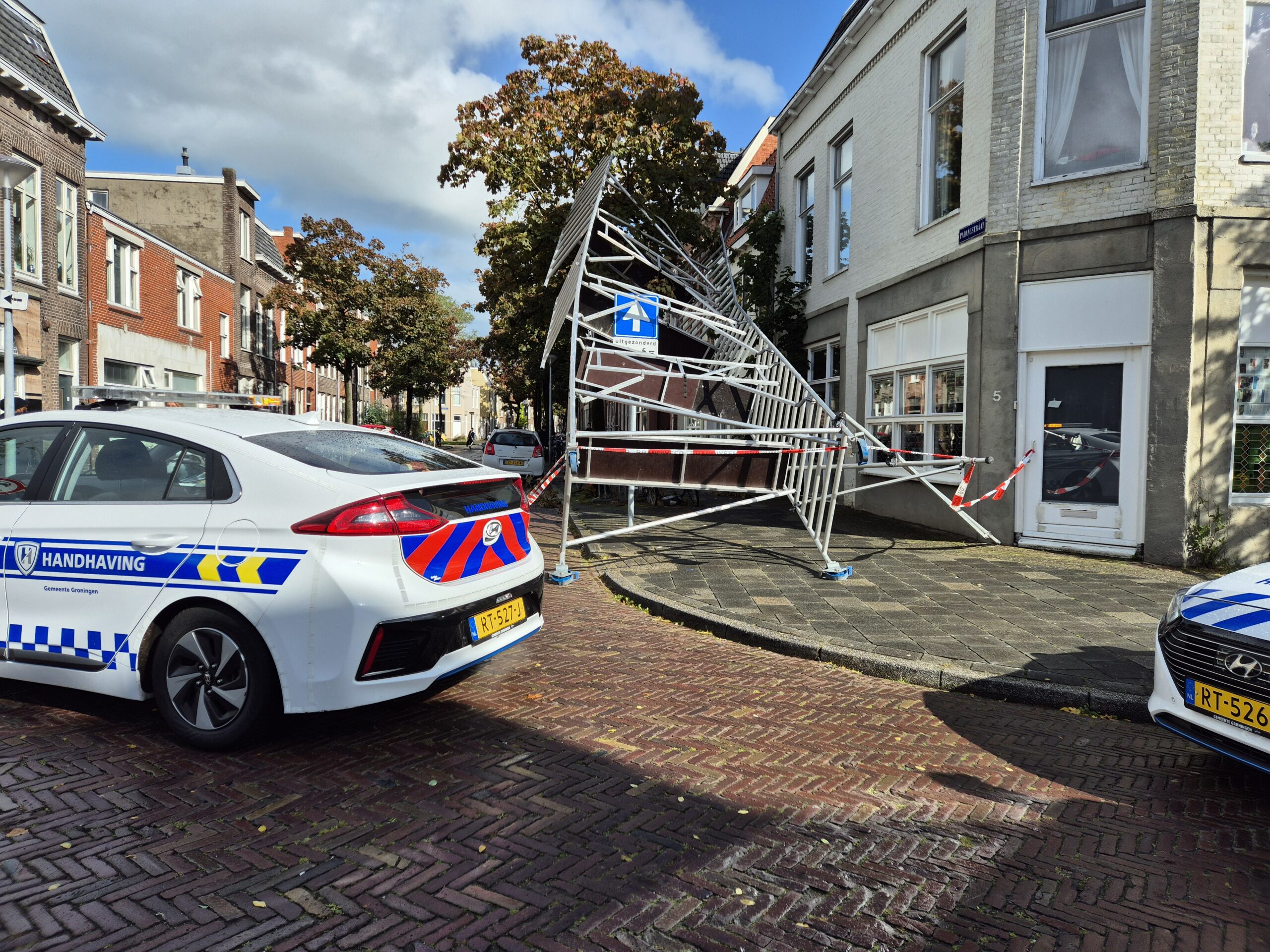 ^Door de wind was een steiger omgevallen in Groningen. De handhaving en de brandweer kwam ter plaatse om de situatie veilig te stellen. Verdere actie was niet nodig.