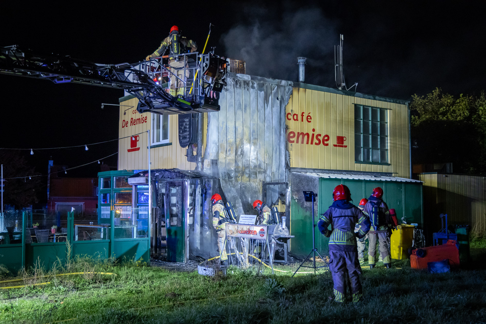 Rond half drie werd de brand ontdekt, kort daarvoor was een zeer harde knal in de omgeving te horen. Meerdere brandweerwagens en politieauto’s reden moet spoed naar de brand toe. Eenmaal ter plaatse bleek de zijkant van het café in brand te staan, dit was een hevige brand. De brandweer kreeg met twee wagens de brand onder controle, echter bleek er nog een hoop sloopwerkzaamheden nodig om de brand volledig te blussen.
