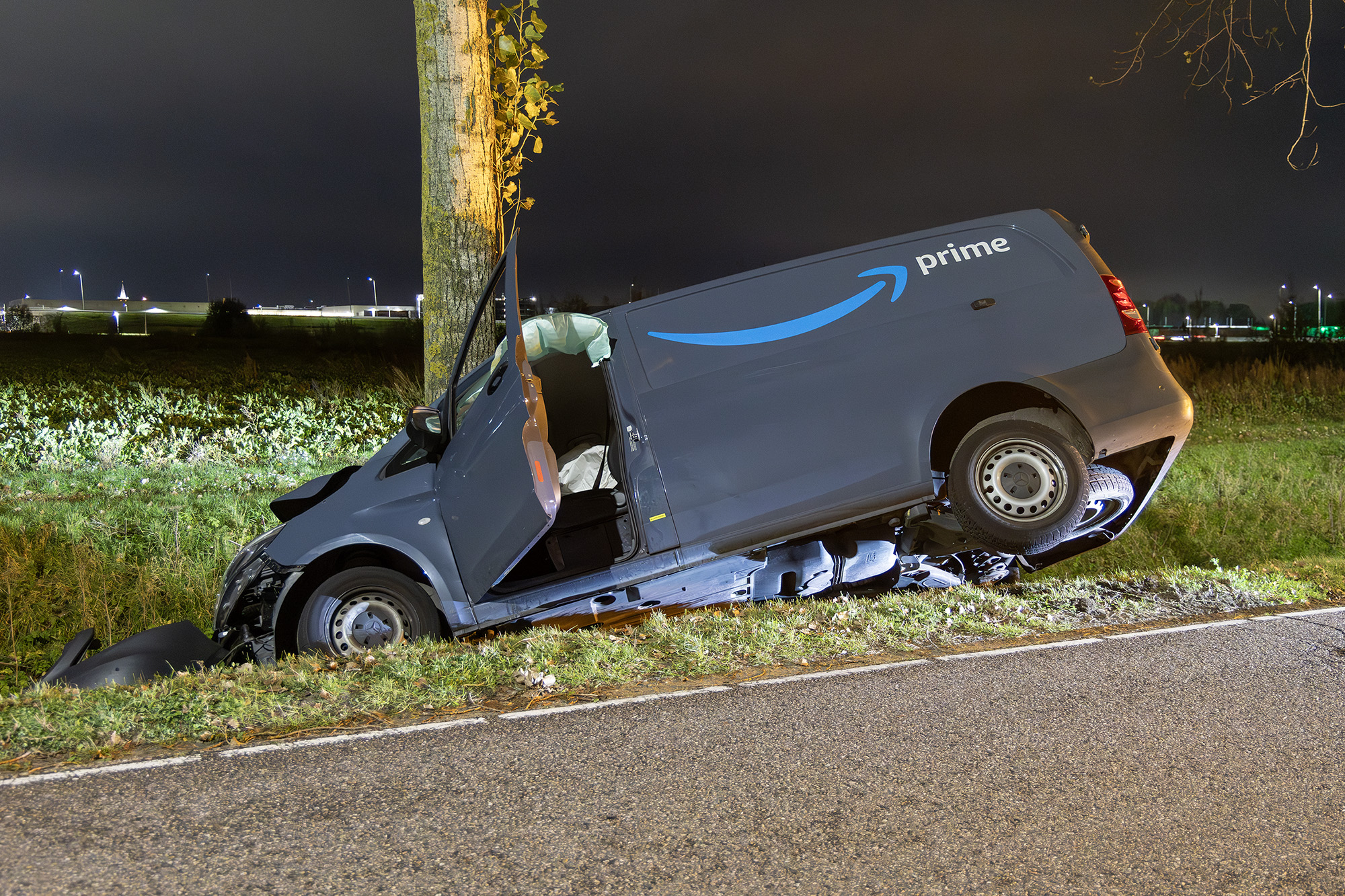 ROZENBURG – Op de Aalsmeerderweg in Rozenburg is woensdagavond rond kwart over acht een bezorgwagen van Prime uit de bocht gevlogen. De bestelbus raakte van de weg en kwam uiteindelijk tegen een boom tot stilstand.