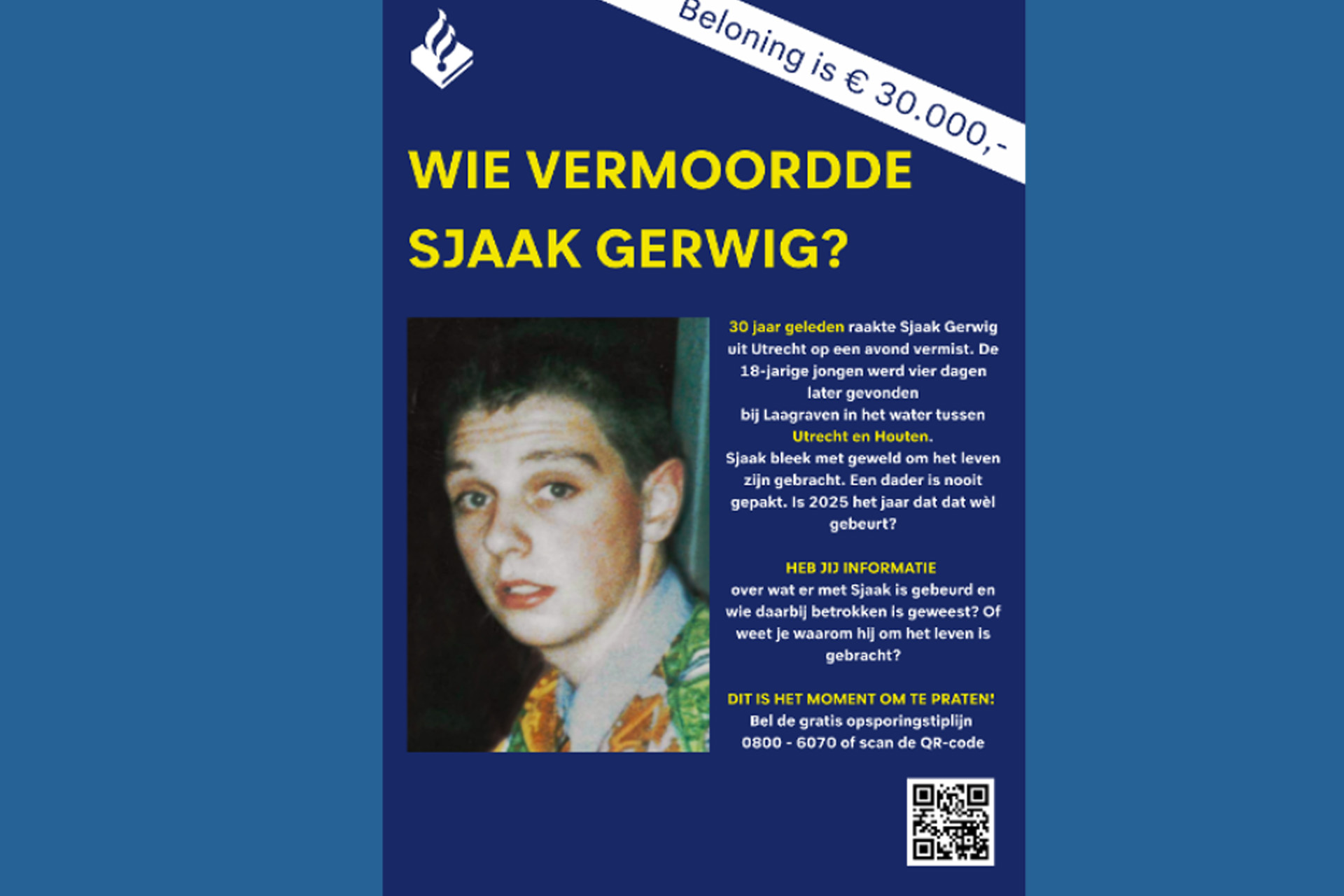 UTRECHT – Dertig jaar na de gewelddadige dood van de 18-jarige Sjaak Gerwig uit Utrecht vraagt het coldcaseteam Midden-Nederland opnieuw om informatie. Op woensdag 29 maart 1995 werd Sjaak voor het laatst gezien toen hij vanuit zijn woning aan de Rijnlaan in de Rivierenwijk naar zijn vriendin liep. Vijf dagen later, op zondag 2 april, werd zijn lichaam gevonden in het water bij Laagraven, tussen Utrecht en Houten.