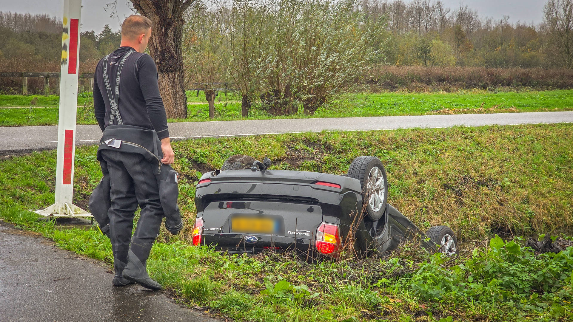 Auto op kop in sloot, omstanders redden drie inzittenden