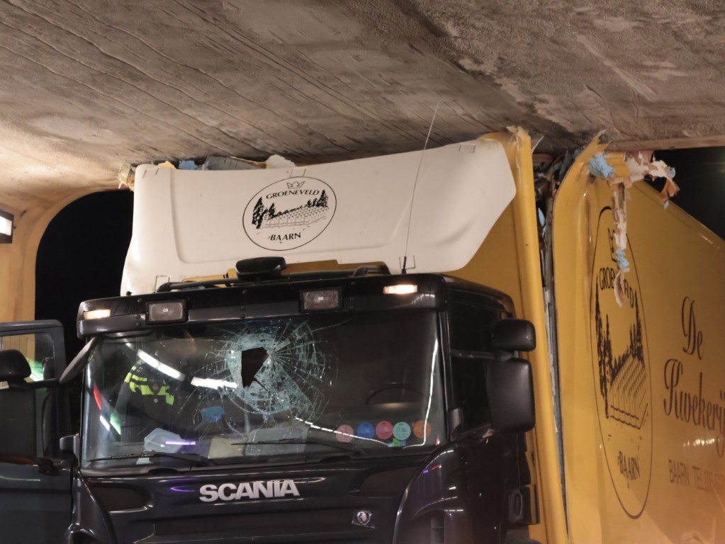 Te hoge vrachtwagen ramt tunnel, chauffeur raakt gewond