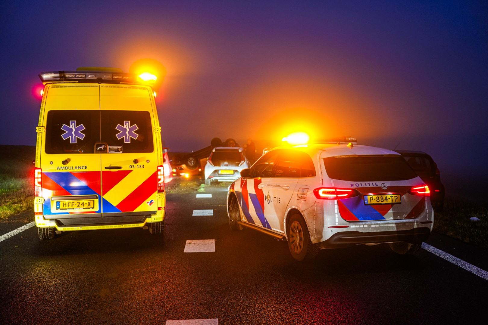 Auto slaat over de kop bij dichte mist op Provincialeweg