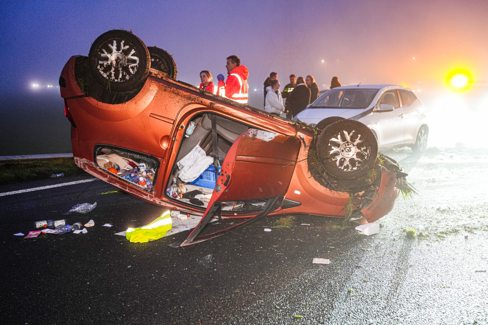 EMMEN – Op de N34 bij Emmen heeft woensdagmiddag rond 16.50 uur een auto over de kop geslagen in dichte mist. Het voertuig raakte van de hoofdrijbaan en kwam ondersteboven tot stilstand op de oprit richting Odoorn.