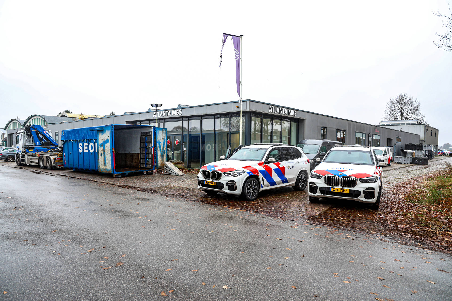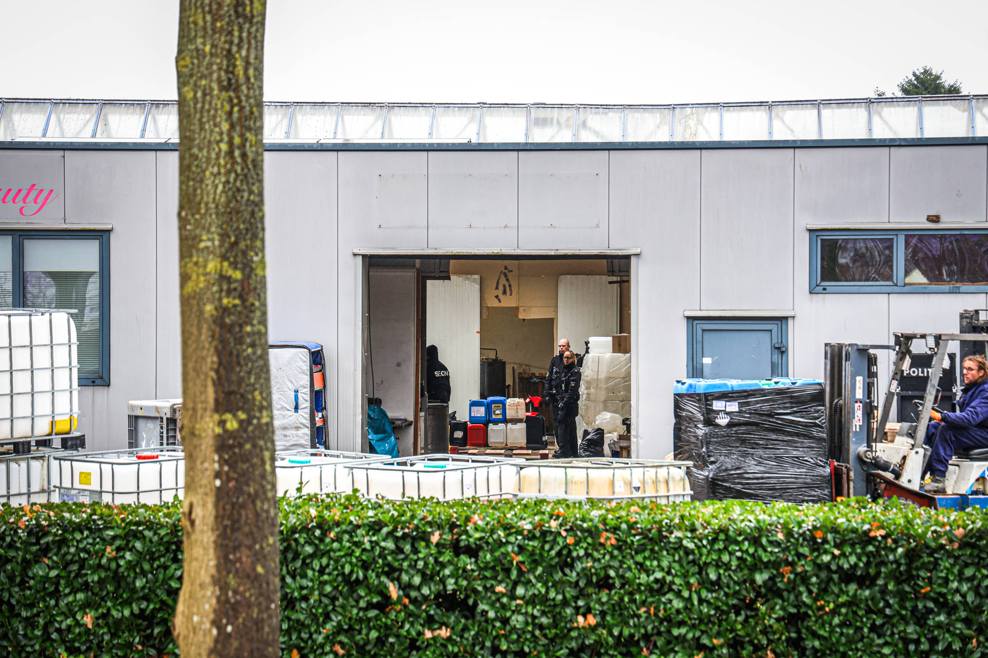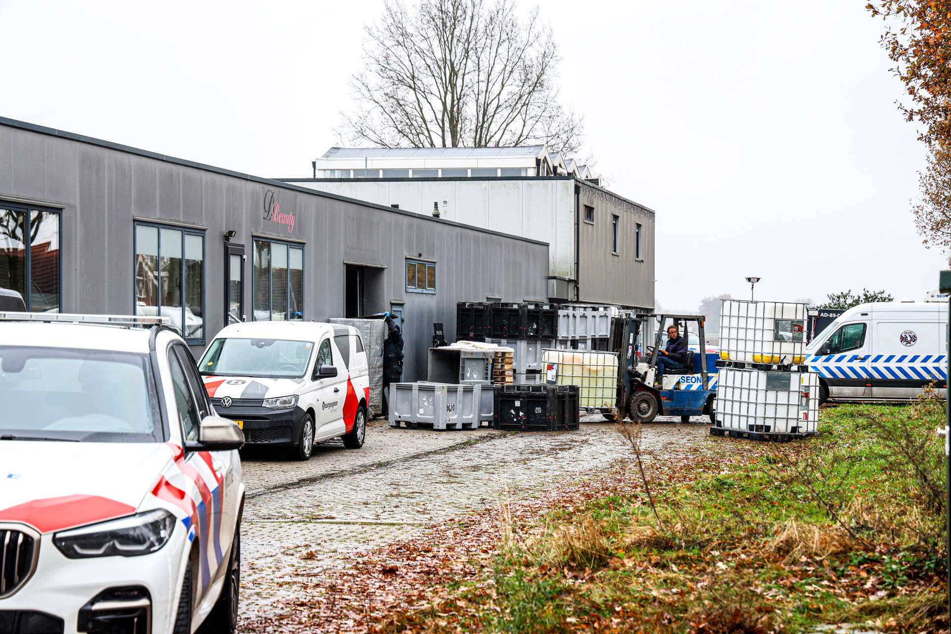 KLAZIENAVEEN – Vrijdagochtend wordt aan de Industriestraat in Klazienaveen verder gewerkt aan het onderzoek en de ontmanteling van een synthetisch drugslab. Donderdagochtend viel het Dienst Speciale Interventies (DSI) het pand binnen en werden twee personen aangehouden.