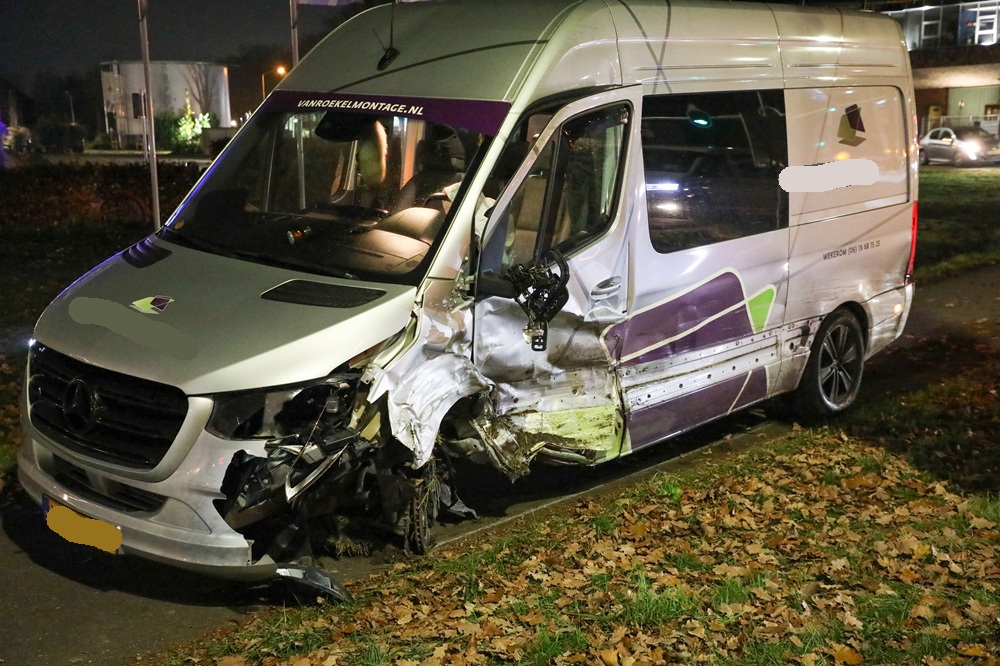 EDE – Op de Rijksweg N224 heeft donderdagochtend rond 06.00 uur een zware aanrijding plaatsgevonden. Op de kruising met de Argonstraat botsten een personenauto en een bestelbus met hoge snelheid op elkaar. Beide voertuigen raakten zwaar beschadigd. De bestelbus kwam na de klap tientallen meters verder tot stilstand op het fietspad, waarbij het voorwiel afbrak en diepe krassen in het asfalt ontstonden.