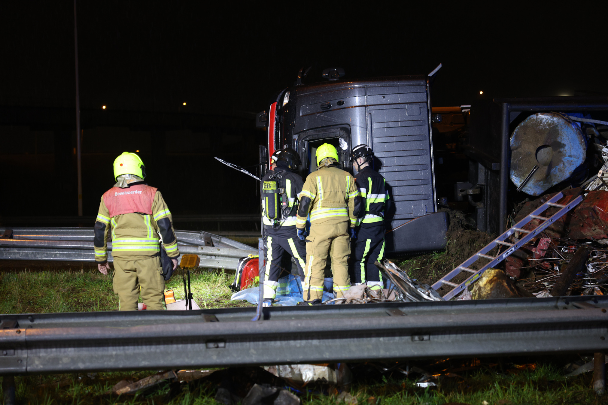 Vrachtwagen gekanteld op snelweg, bestuurder bevrijd