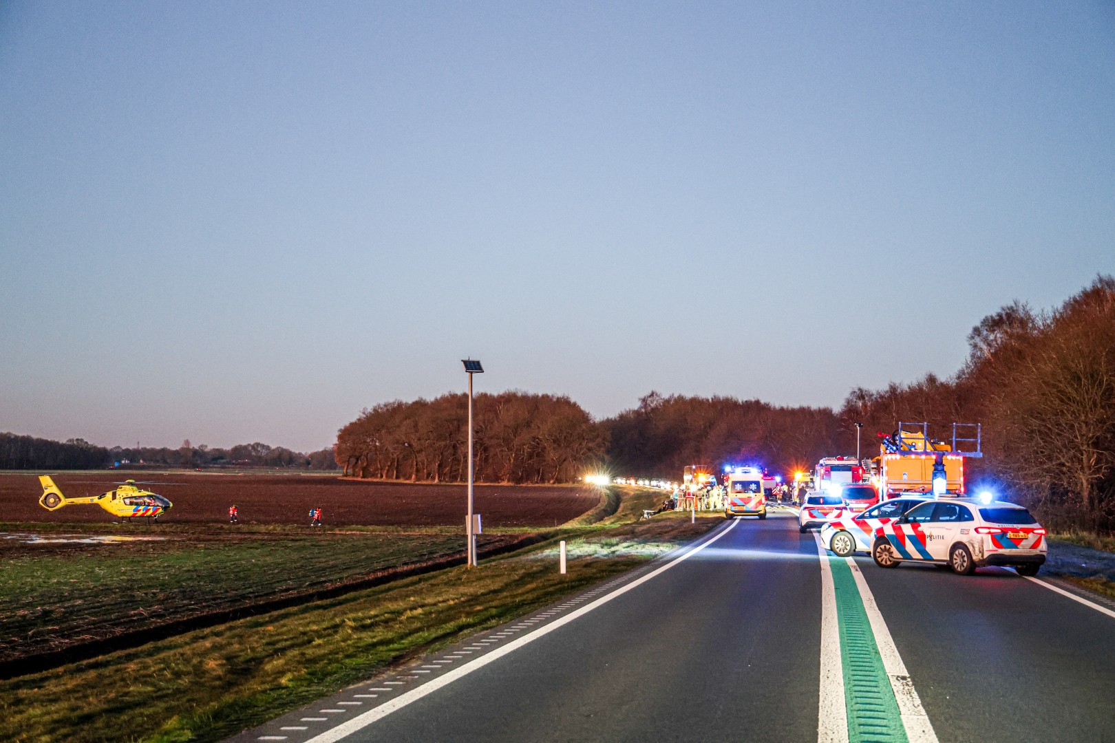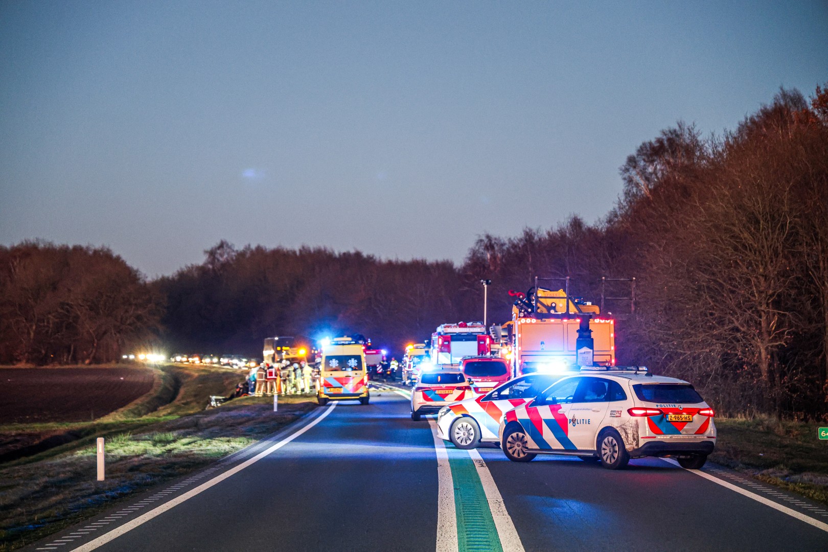 De hulpverlening nam geruime tijd in beslag. De N34 is in beide richtingen afgesloten en blijft naar verwachting nog enkele uren dicht voor onderzoek. De politie onderzoekt de toedracht van het ongeval.