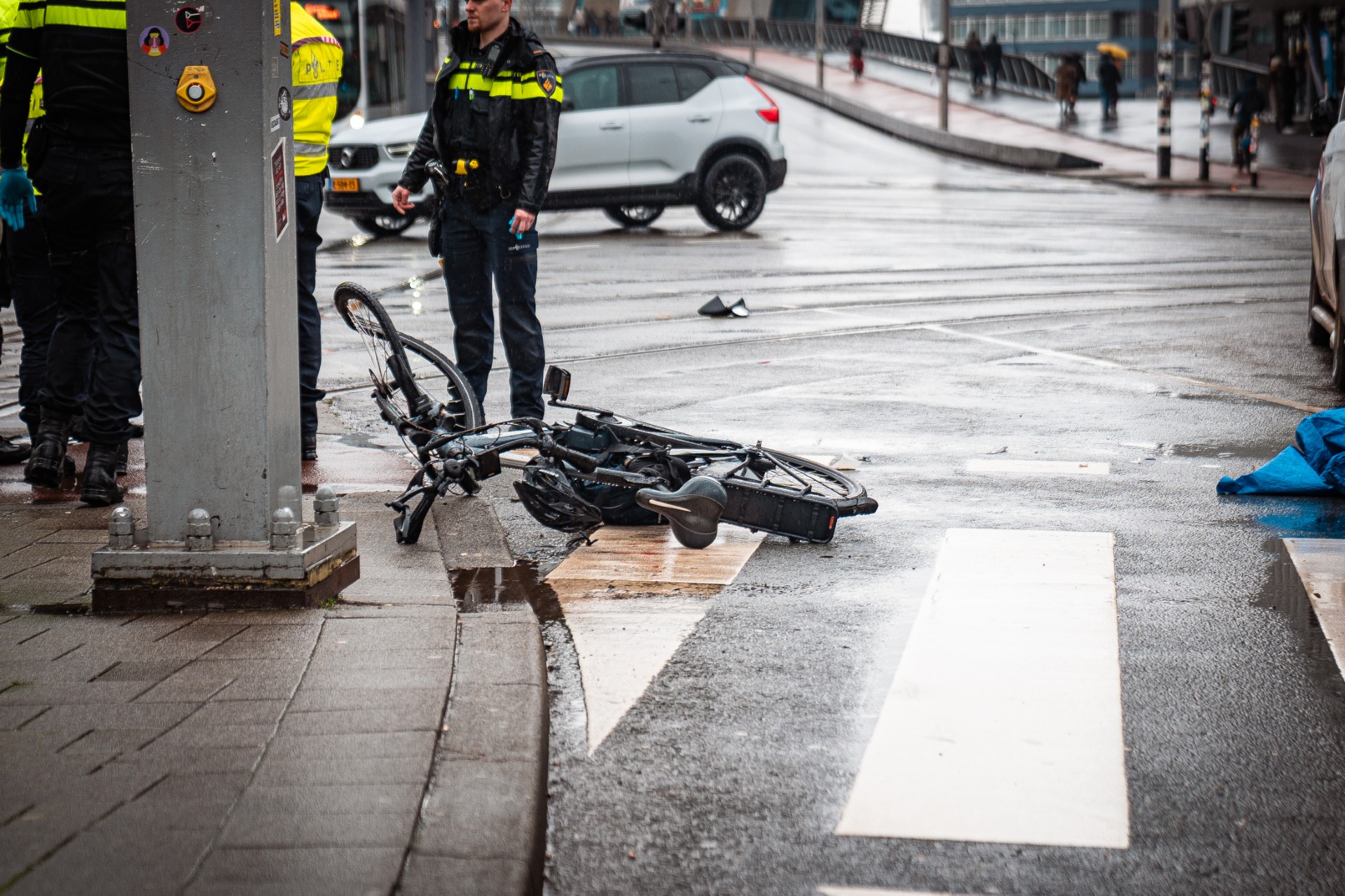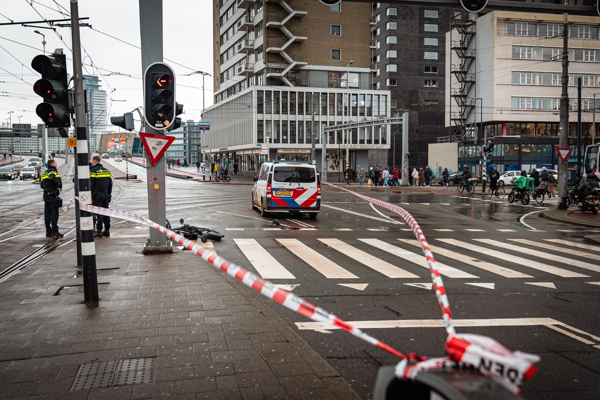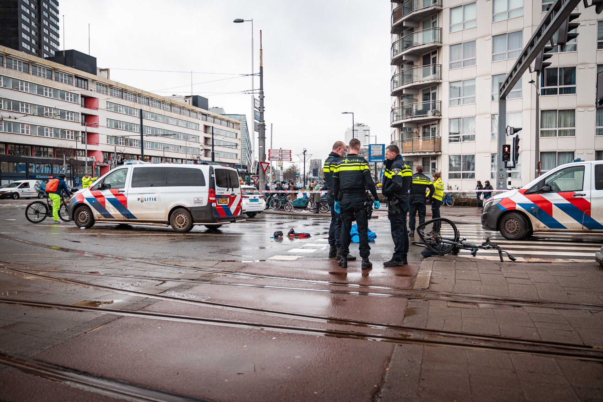 De fiets van de man ligt verwrongen op de rijbaan en de weg is volledig afgesloten voor verkeer. Ook tramverkeer richting de Erasmusbrug ligt stil; passagiers uit stilstaande trams zijn geëvacueerd. Agenten begeleiden het vaststaande verkeer langs de ongevalslocatie.