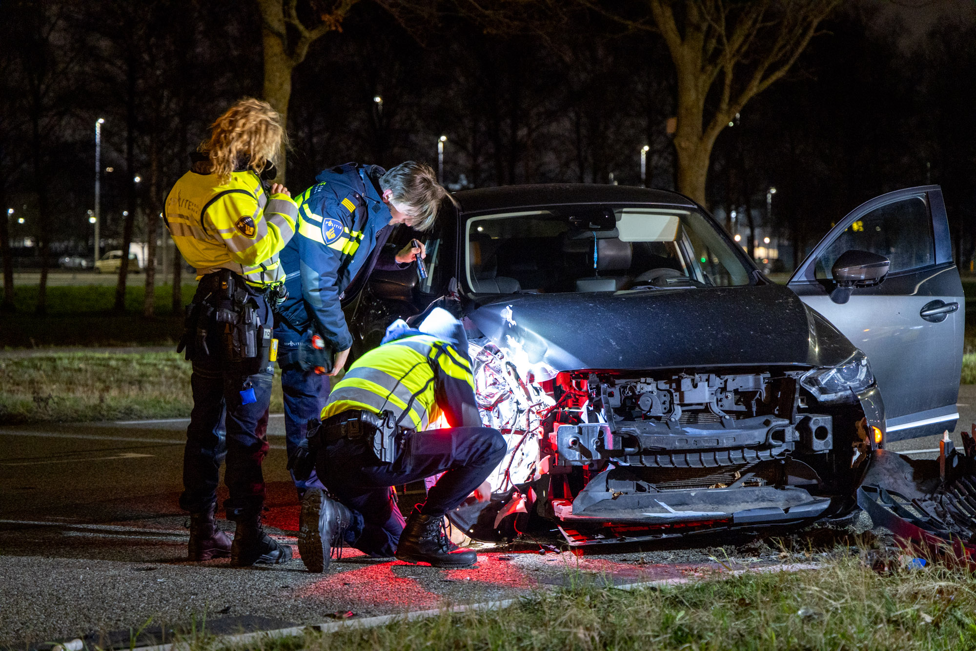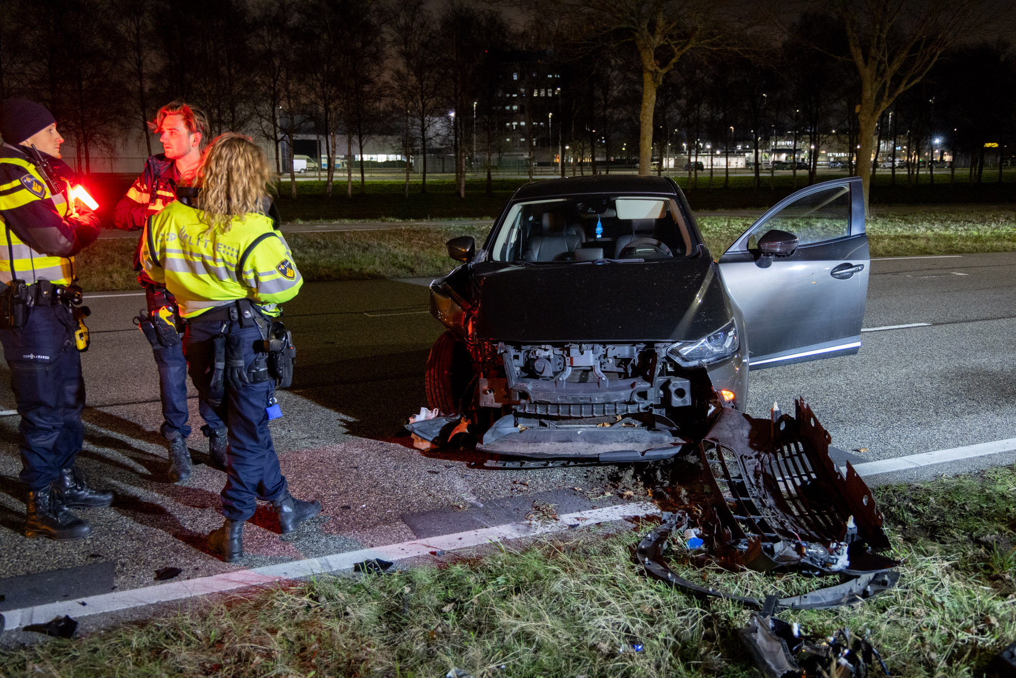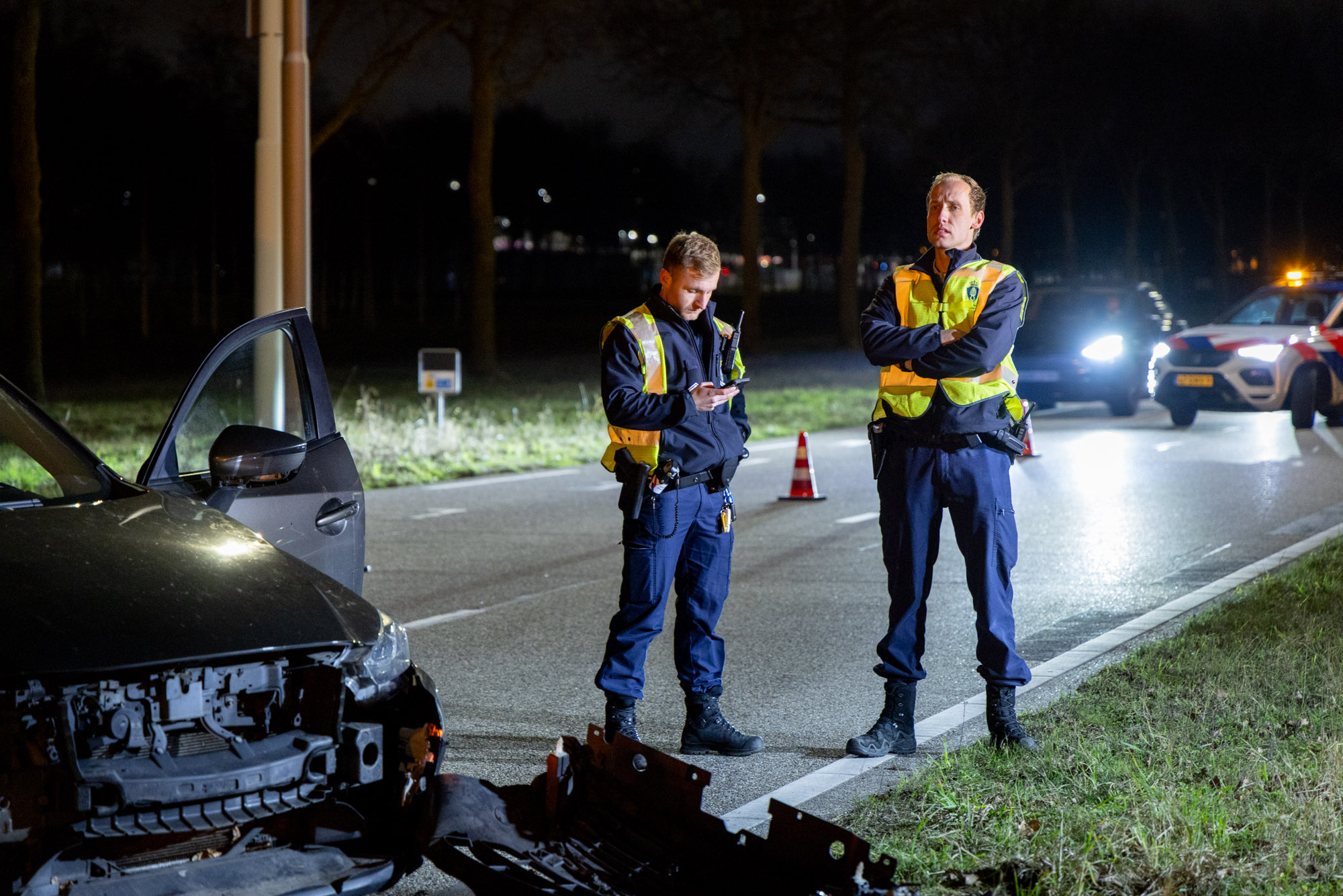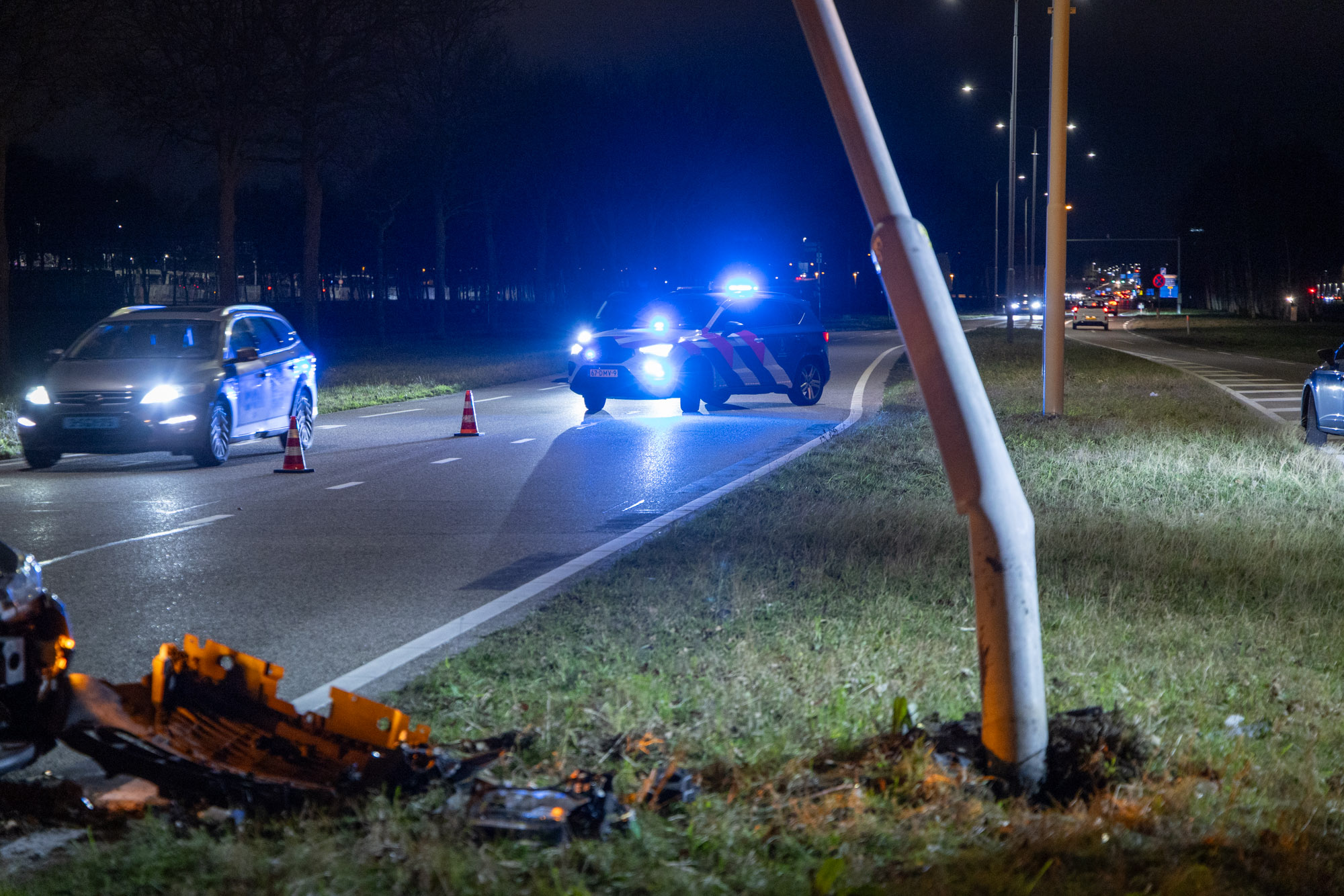 De politie sloot samen met de Koninklijke Marechaussee een deel van de weg af. De wegbeheerder kwam ter plaatse om de beschadigde lantaarnpaal veilig te stellen. De auto is door een bergingsbedrijf afgevoerd. Hoe het ongeval heeft kunnen gebeuren, is niet bekend. Er waren geen andere voertuigen bij de botsing betrokken.
