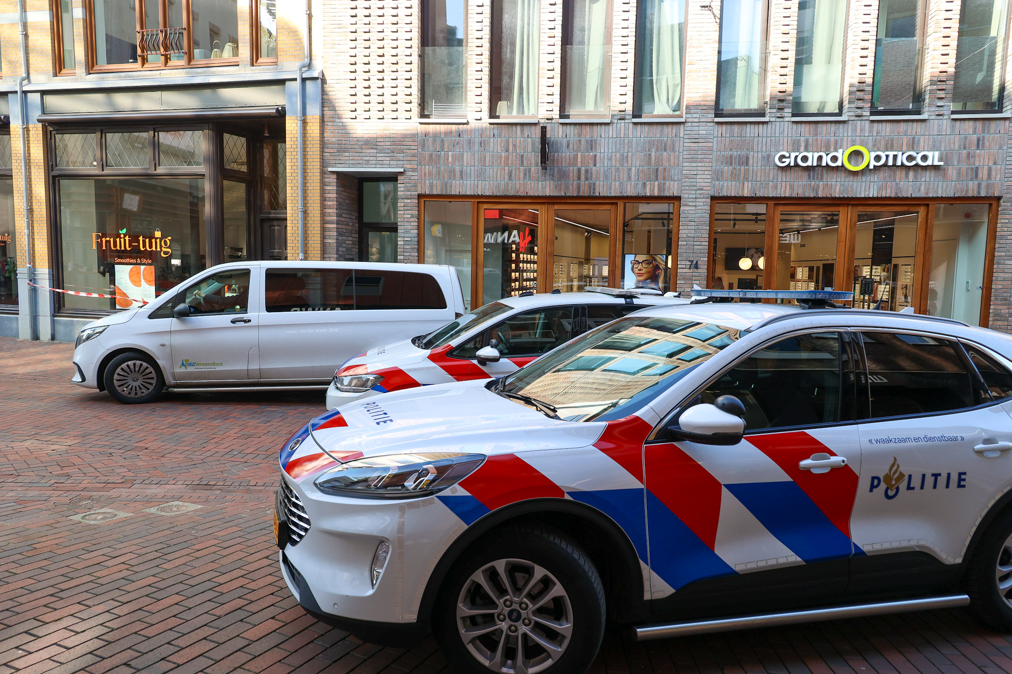 Door de inzet is de Bussummerstraat afgesloten. Ook een deel van de onderliggende winkelstraat is afgezet voor publiek; winkels blijven toegankelijk.
