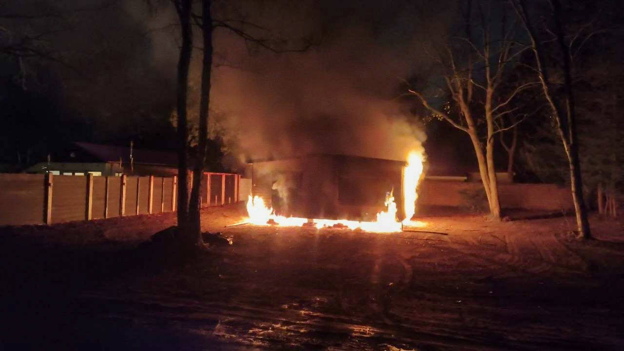 Het chalet stond pas twee dagen op de locatie, kort aan de weg. Brandweerlieden hadden enige tijd nodig om het vuur onder controle te krijgen. Een kraanwagen kwam ter plaatse om het chalet uit elkaar te halen.