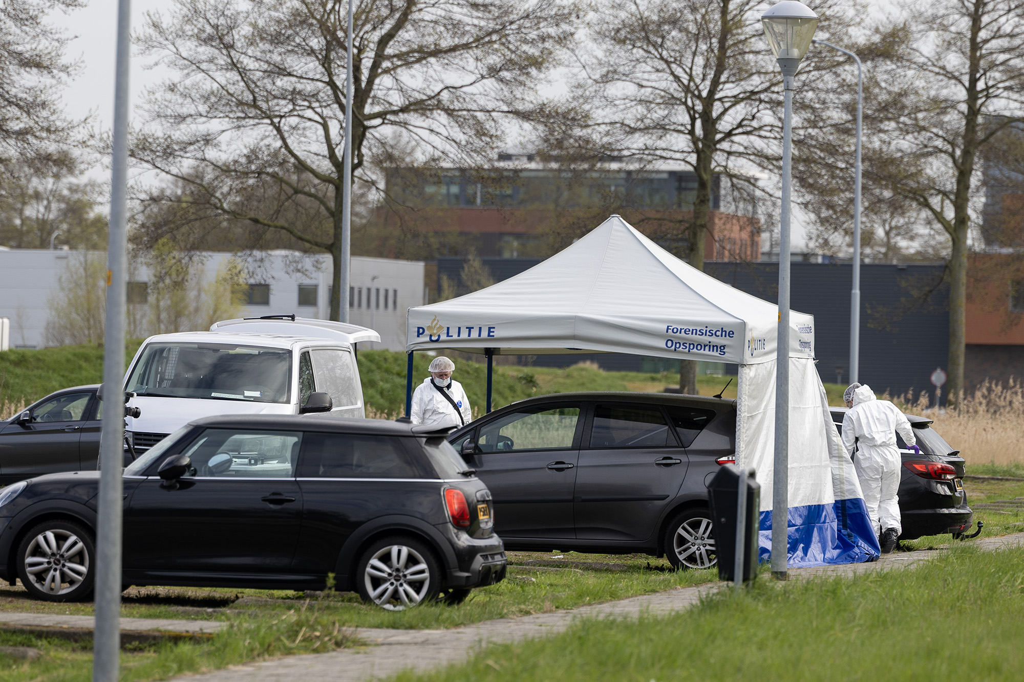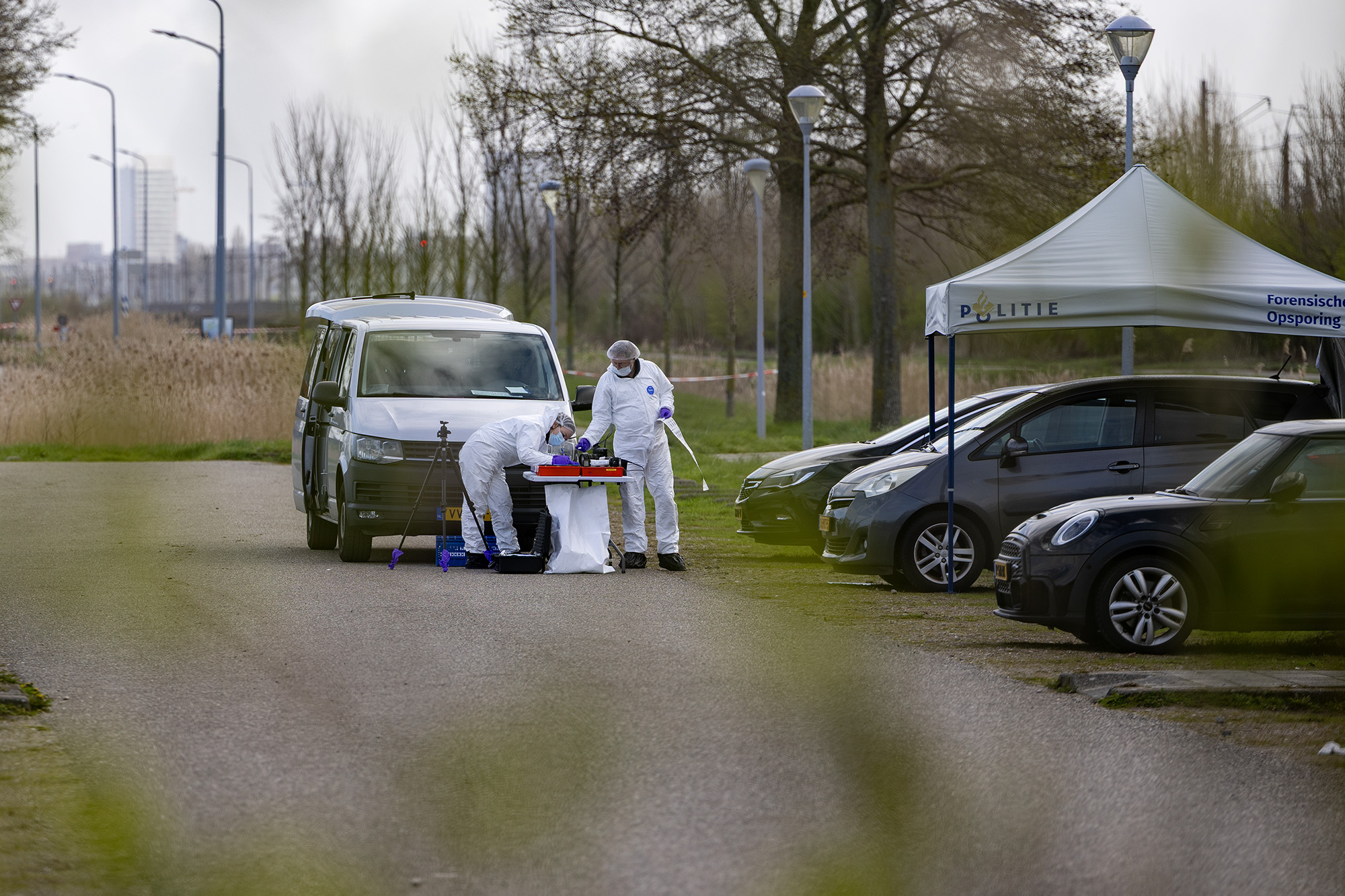 Het lichaam werd maandagavond rond 19.30 uur gevonden op het parkeerterrein. Sindsdien vindt er uitgebreid onderzoek plaats, dat dinsdagochtend nog in volle gang was. Forensisch onderzoekers richten zich met name op een geparkeerde auto, die onder een tent is geplaatst. Rechercheurs in beschermende kleding verrichten daar sporenonderzoek, terwijl een deel van het terrein is afgezet en een politiecontainer in de nabijheid staat.