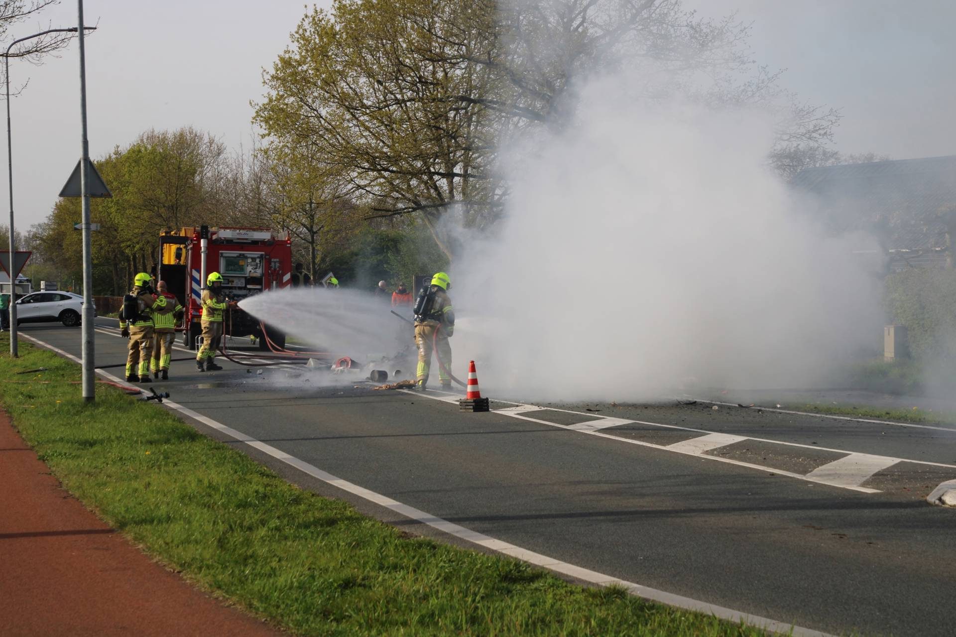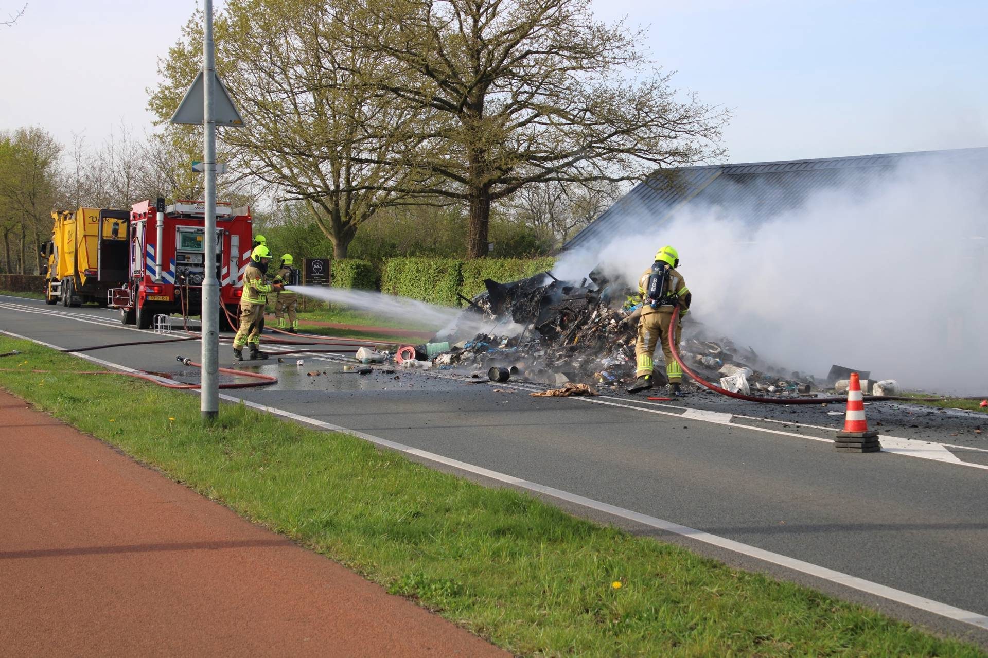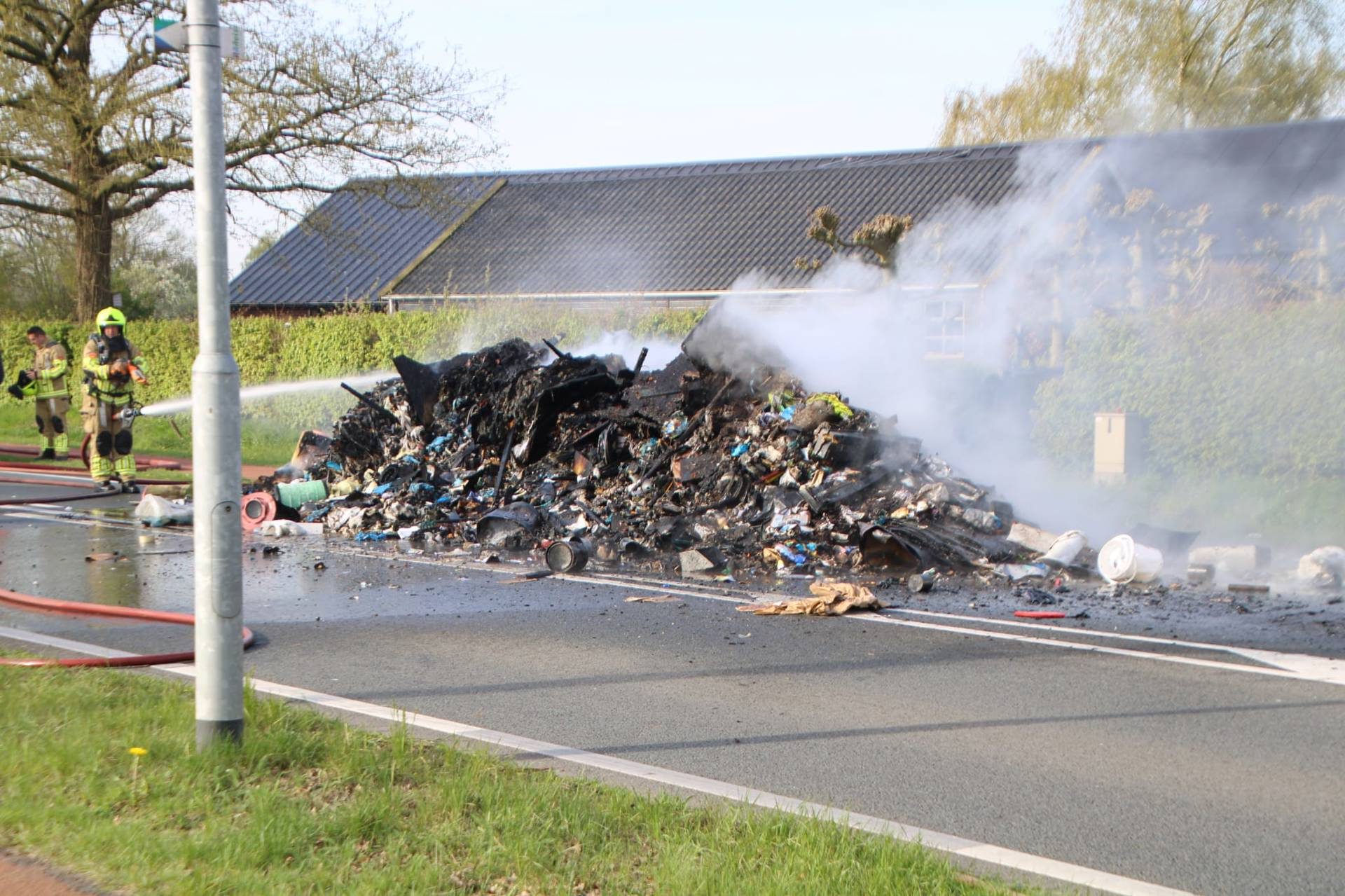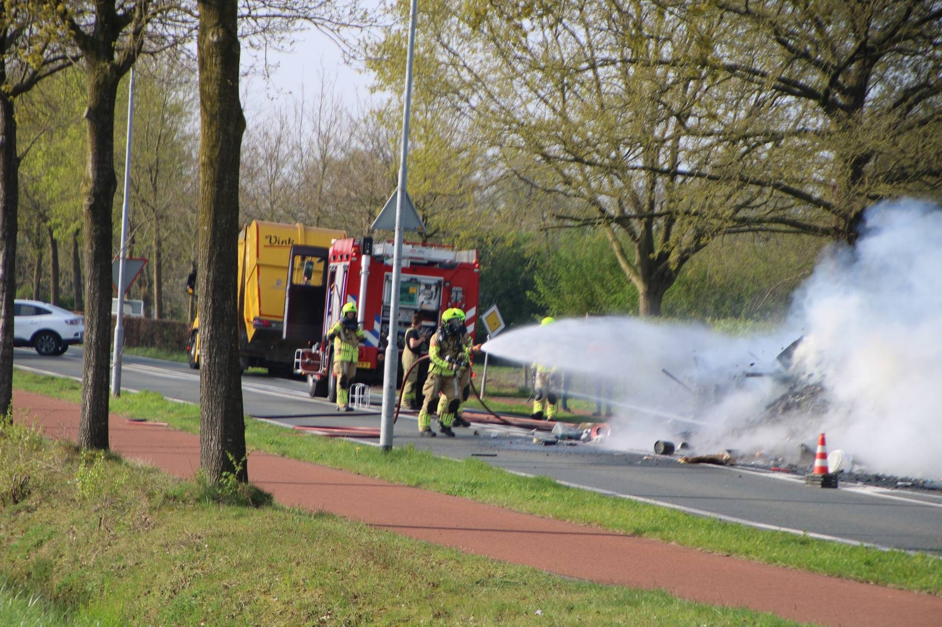 VOORTHUIZEN – Op de Rijksweg in Voorthuizen heeft een vuilniswagen woensdagmorgen een lading afval op straat gelost, nadat in het afval brand was ontstaan.