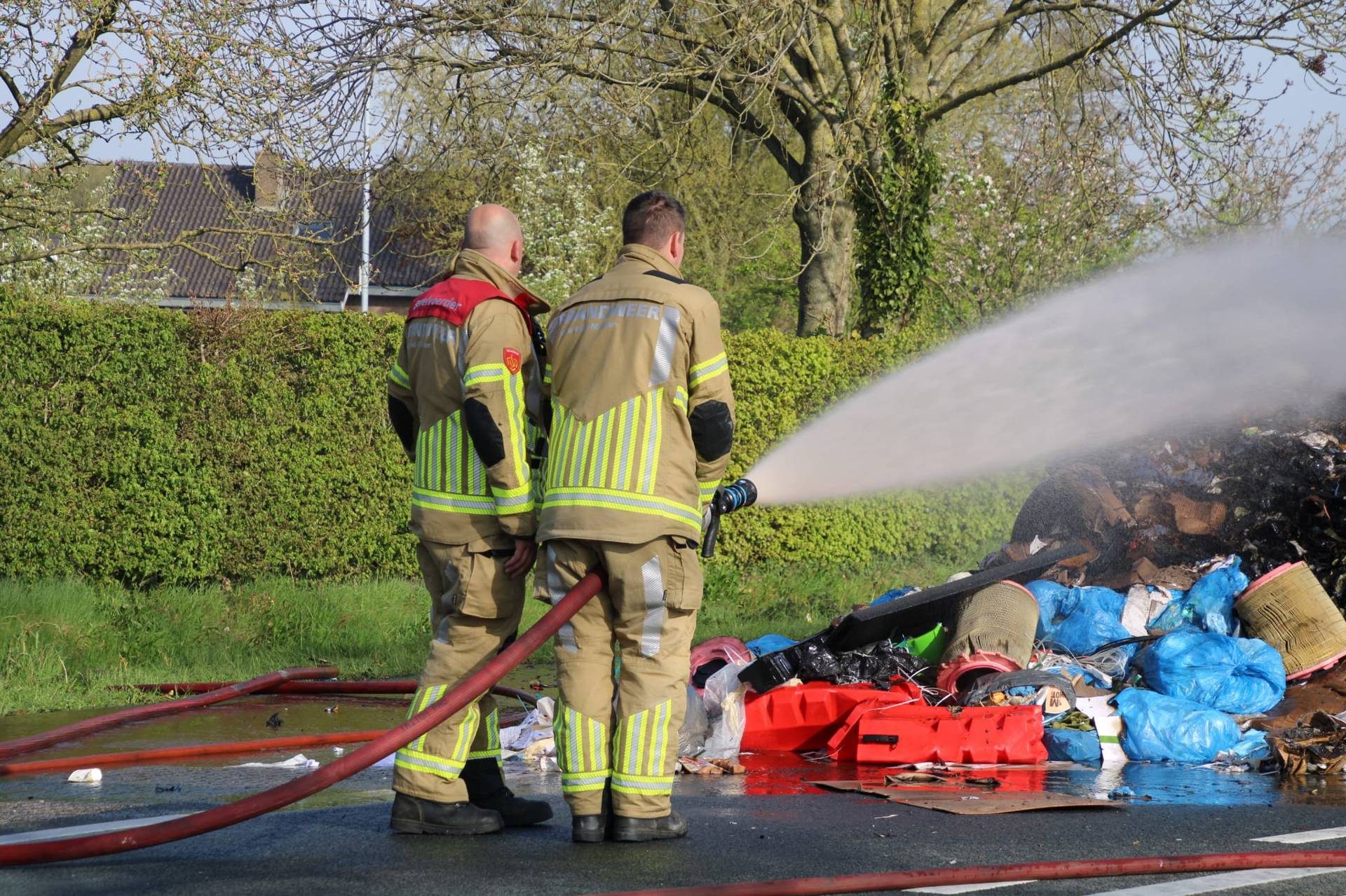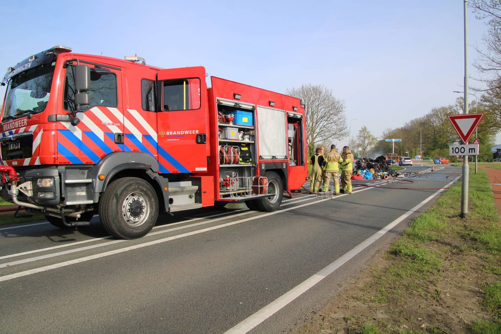 De brandweer van Voorthuizen werd rond 09:10 uur met spoed opgeroepen. Door de brandende afvalberg was de Rijksweg tijdelijk afgesloten voor het verkeer. De brandweer had enige tijd nodig om het vuur onder controle te krijgen en te blussen.