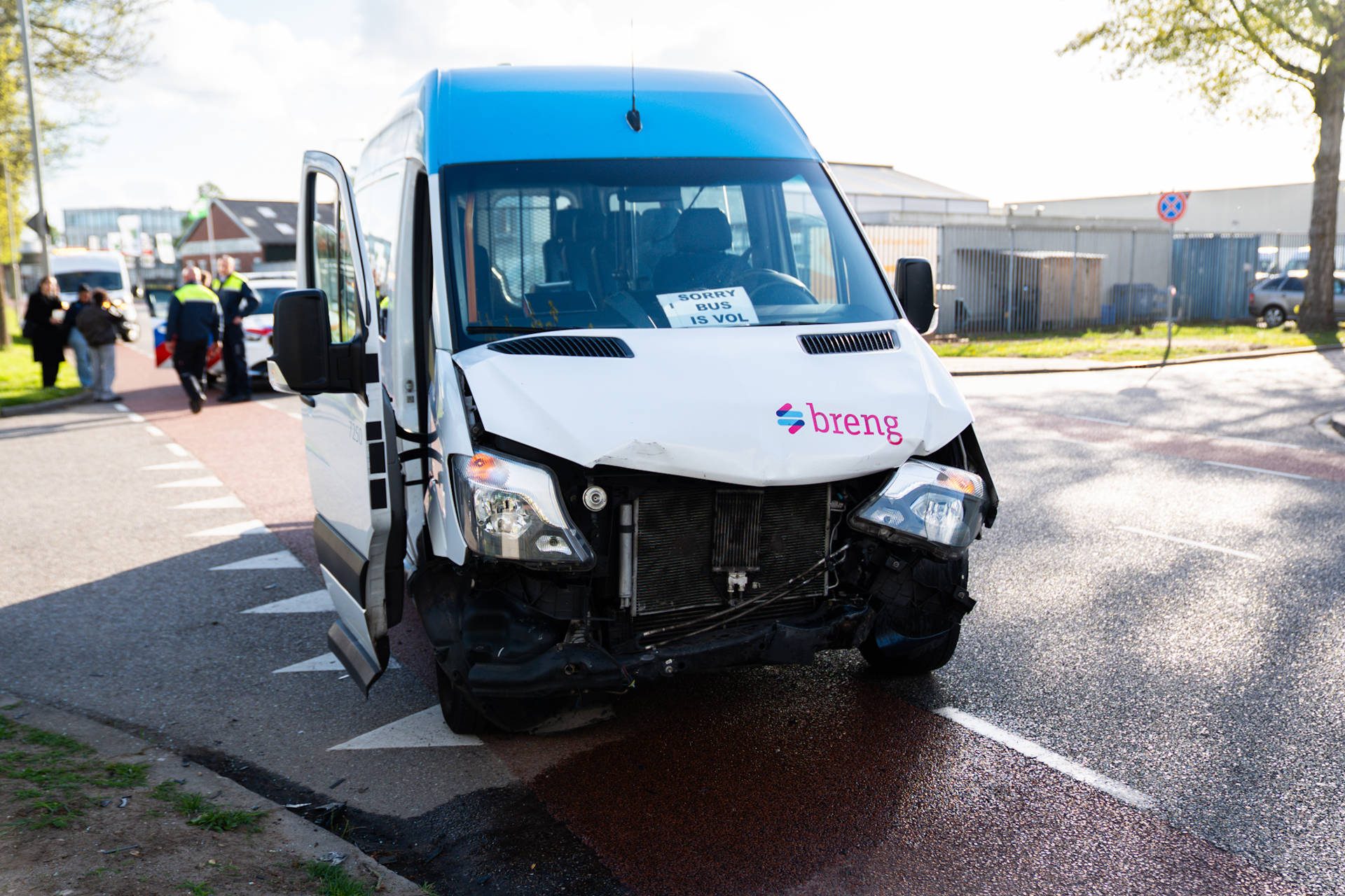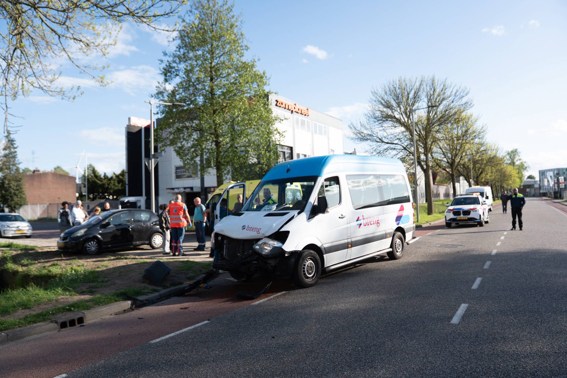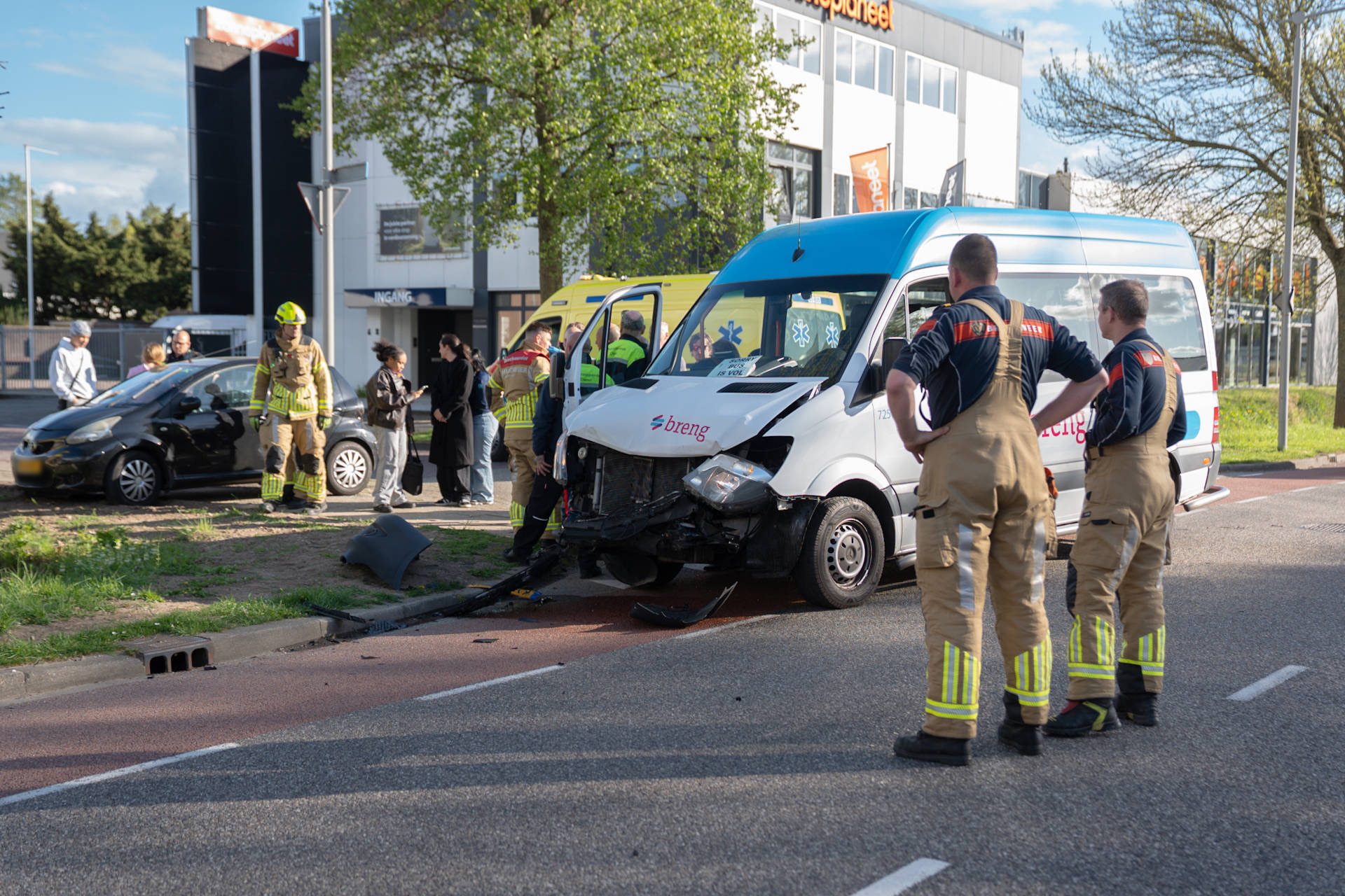 Volgens de eerste informatie botste de bestuurder van de buurtbus tegen de zijkant van de auto. Door de aanrijding raakten beide voertuigen beschadigd. Ambulancepersoneel controleerde zowel de bestuurder van de auto als die van het busje, maar niemand hoefde mee naar het ziekenhuis. Ook de inzittenden van de buurtbus kwamen met de schrik vrij. Voor hen werd vervangend vervoer geregeld.