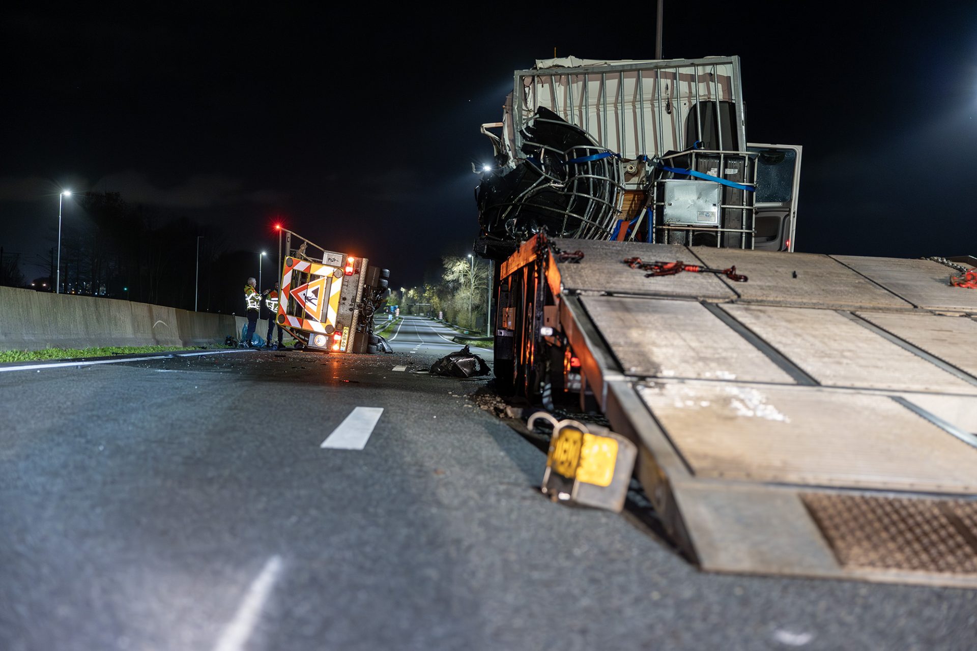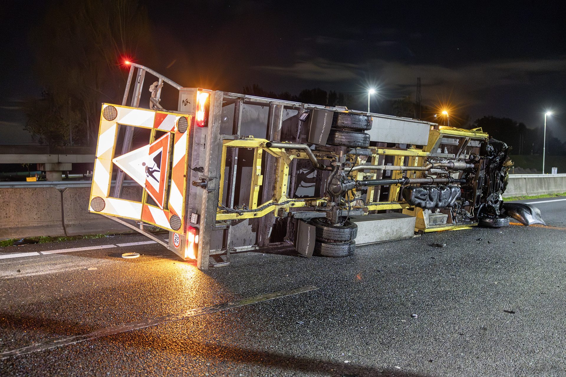 Volgens de eerste informatie reed de werkwagen tijdens de werkzaamheden de trailer op, raakte de cabine van de vrachtwagen, waarna het voertuig werd gelanceerd. De werkwagen kwam uiteindelijk op zijn kant terecht en bleef midden op de snelweg liggen.