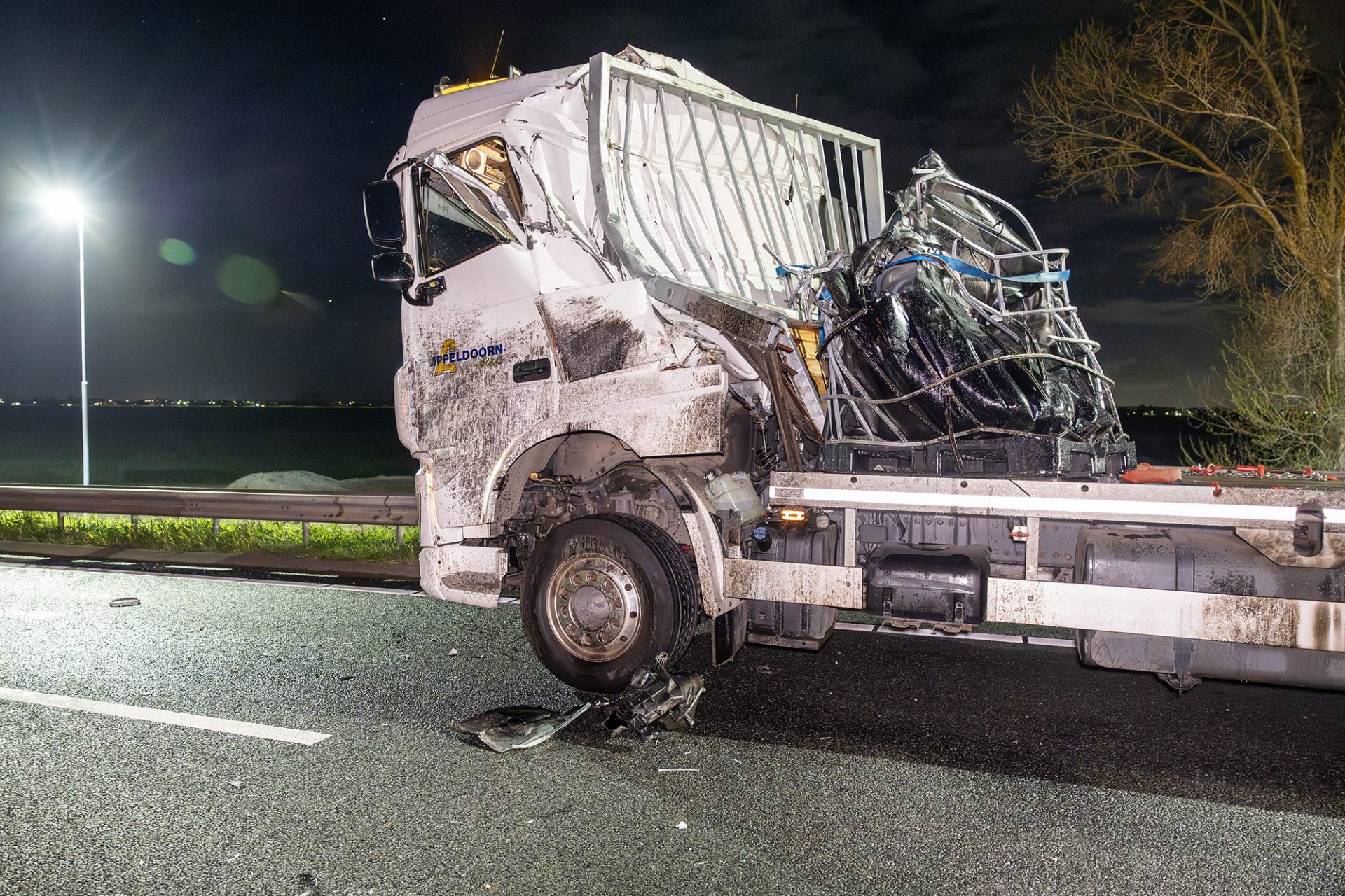 ABBENES – Op de A44 bij Abbenes heeft zicht in de nacht van zondag op maandag rond middernacht een opmerkelijk en ernstig ongeval plaatsgevonden tijdens wegwerkzaamheden. Daarbij werd een werkwagen via een trailer van een vrachtwagen gelanceerd, met een enorme ravage tot gevolg.