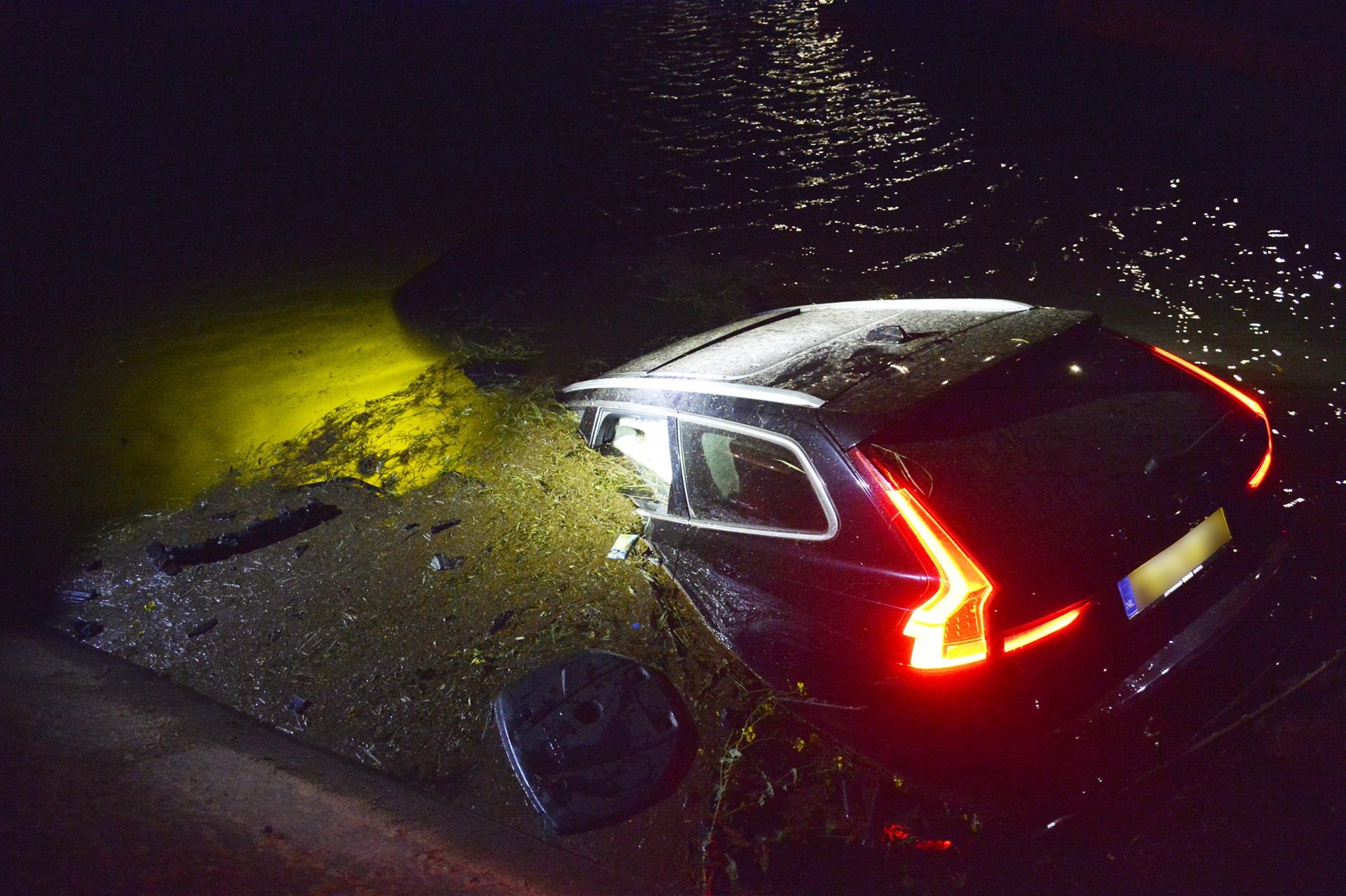 Auto vliegt over hek en belandt in water, bestuurder en twee kinderen naar het ziekenhuis