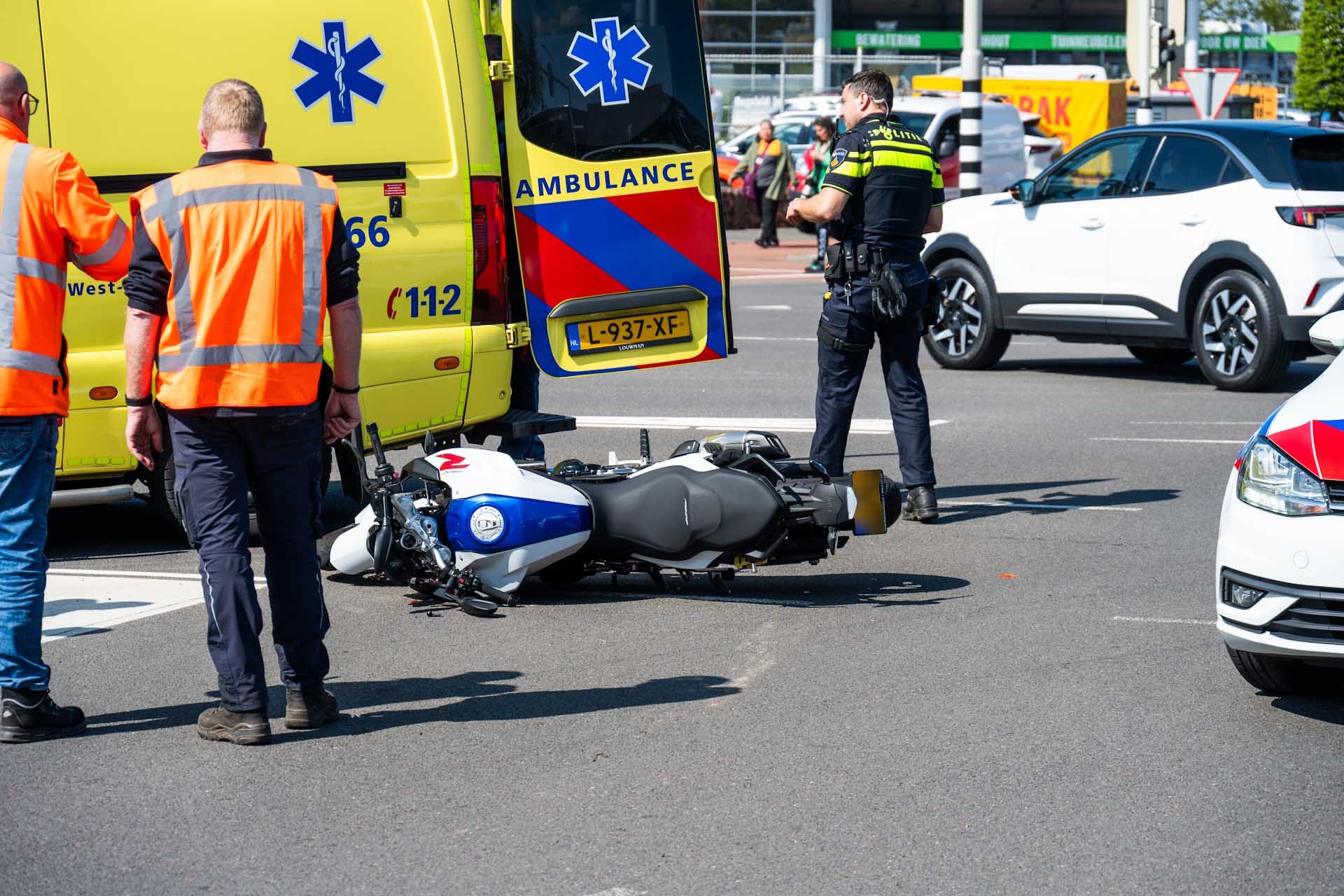 Volgens eerste informatie trok de motorrijder vermoedelijk bij groen licht op en botste vervolgens tegen de veegwagen van de gemeente. De bestuurder van de veegwagen bleef ongedeerd. De motorrijder raakte gewond en is door ambulancepersoneel behandeld en overgebracht naar het ziekenhuis. Over de ernst van het letsel is niets bekend.