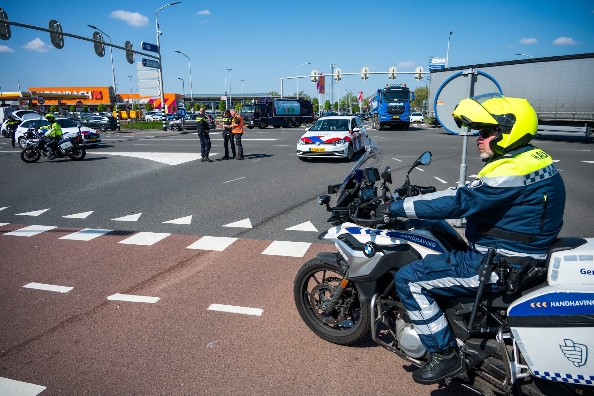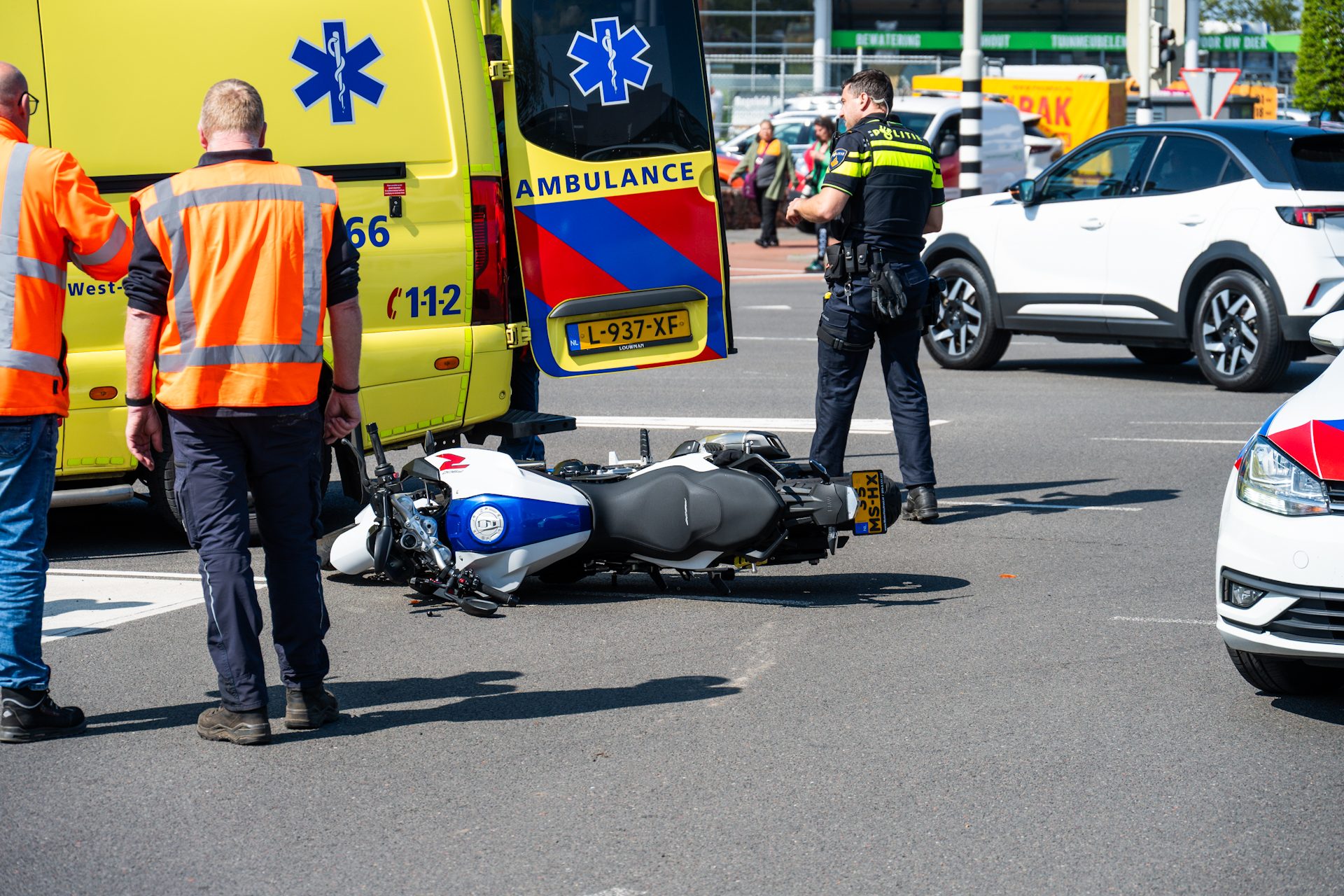 De motor liep schade op en is door de politie afgevoerd. De veegwagen raakte eveneens beschadigd, maar kon op eigen kracht verder rijden. Een deel van de kruising werd tijdelijk afgesloten voor onderzoek en afhandeling, maar is inmiddels weer vrijgegeven.