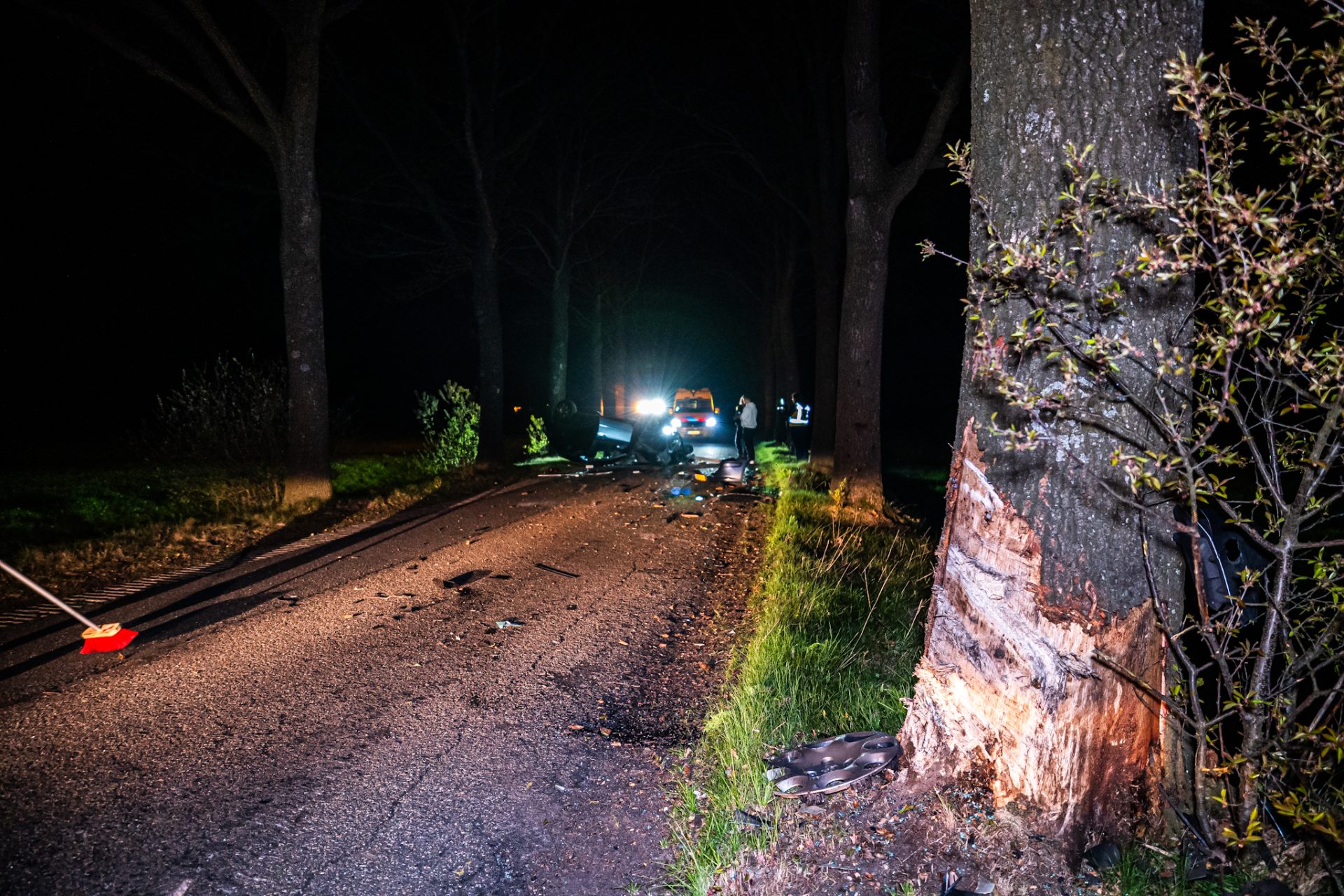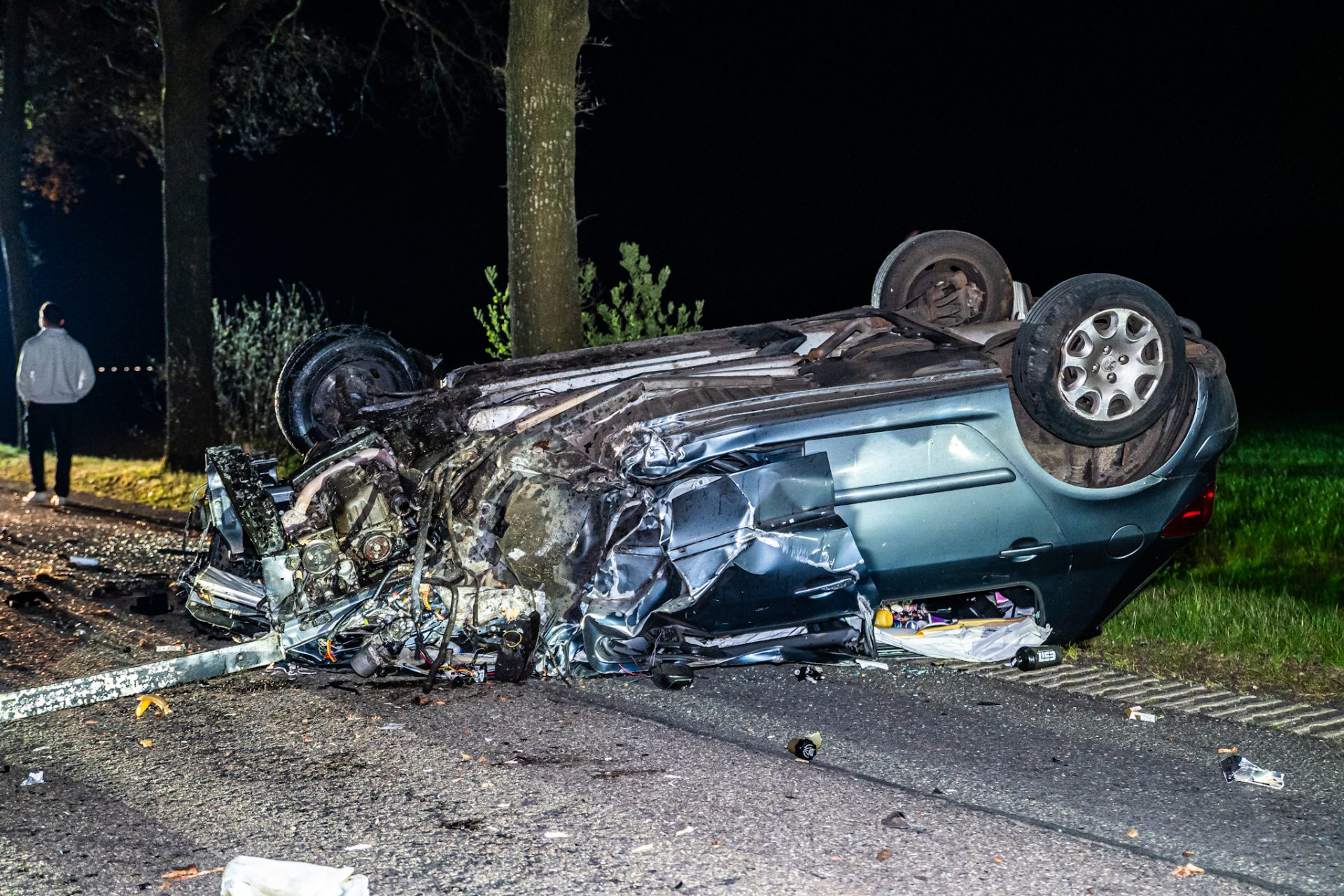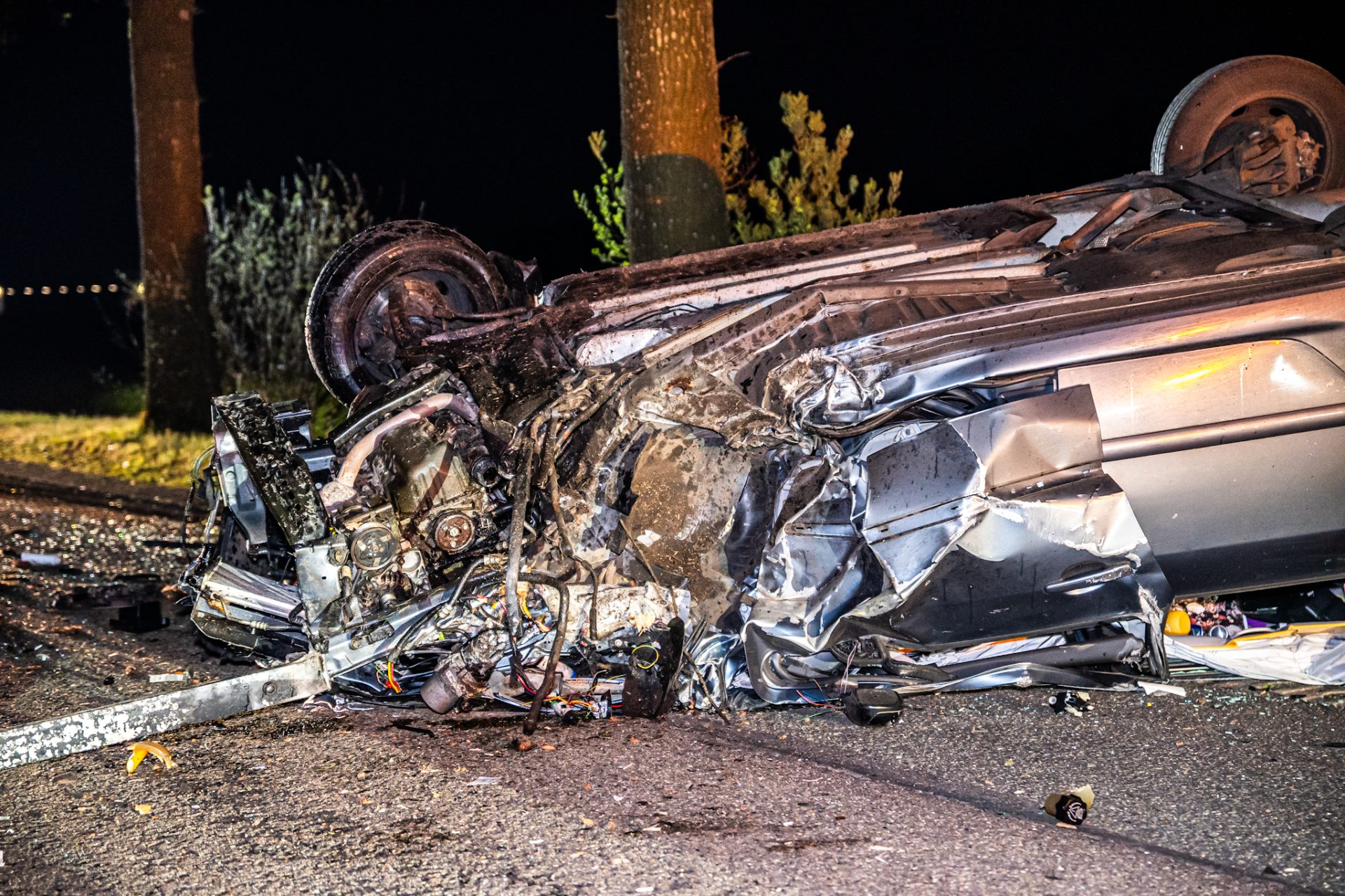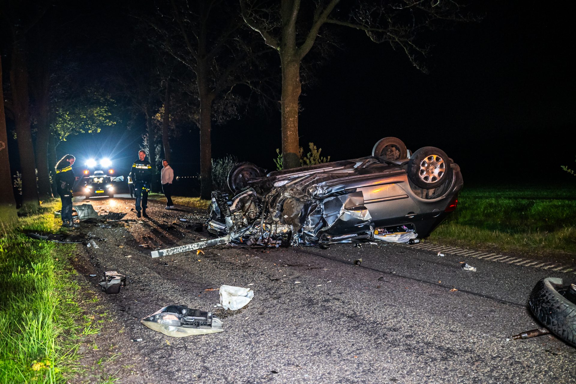 Hulpdiensten, waaronder politie en ambulance, kwamen snel ter plaatse. Bij aankomst bleek een auto tegen een boom te zijn gebotst, waarna het voertuig door de impact over de weg tollen en op de kop tot stilstand kwam. Meerdere onderdelen van de auto lagen verspreid over de weg.