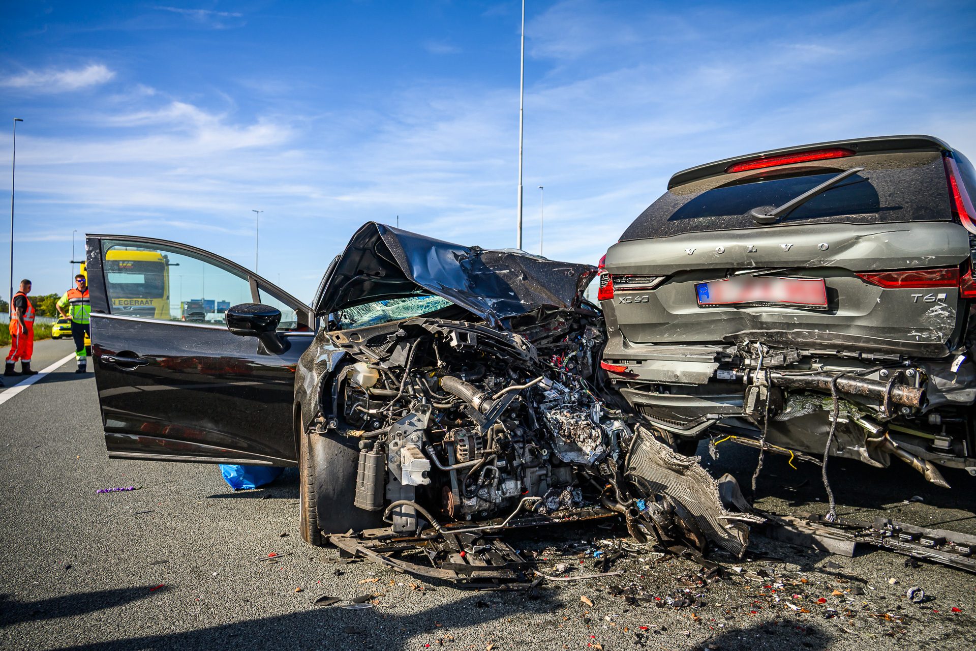 Een berger is aanwezig om beide voertuigen af te slepen.