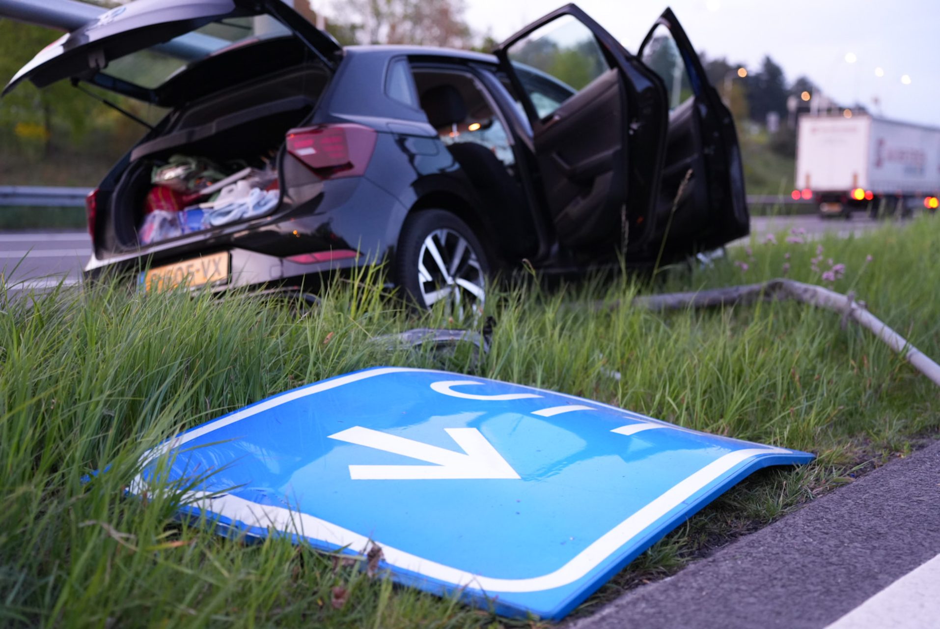 De auto reed een lantaarnpaal en een verkeersbord uit de grond en kwam verderop op het talud tot stilstand. Bij aankomst van de politie bleek er geen bestuurder meer bij het zwaar beschadigde voertuig aanwezig te zijn.
