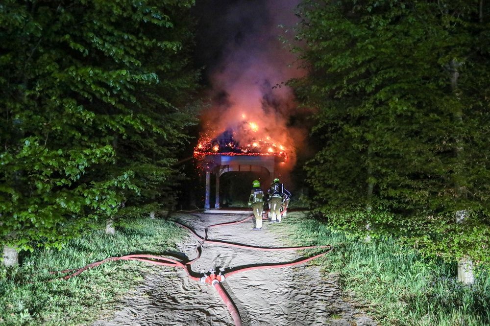 Een wandelaar ontdekte de brand tijdens het uitlaten van zijn hond en belde de hulpdiensten. De brandweer moest een slagboom forceren om bij het prieel, dat diep in het bos staat, te komen. Het rieten dak van het eeuwenoude rijksmonument stond volledig in brand.